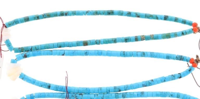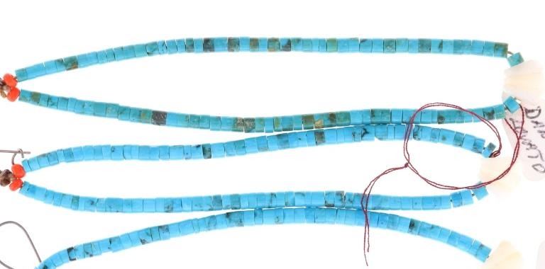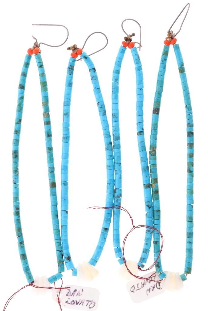 For you bidding pleasure in this lot is a pair of Santo Domingo Jacla style earring sets made of Sleeping Beauty turquoise and moonstones. The earrings are a long strand loop of turquoise beads on wire hangers for pierced ears. Both pairs start and end with a red seed bead and have three moonstones at the center of each loop. The first set of earrings is made with bright Robin Egg Blue Sleeping Beauty turquoise disks and measures 3 3/4" long (at the point of the loop). The second set of earrings is the same, except the turquoise in this set is a green/turquoise color of Sleeping Beauty turquoise. The second set of earrings measure 4" (at the point of the loop). Due to the style of earrings these are, there is no place for an artist hallmark, but these earrings came with original purchase tags stating they are made by famous artist Dan Lovato. These earing sets are in good condition.