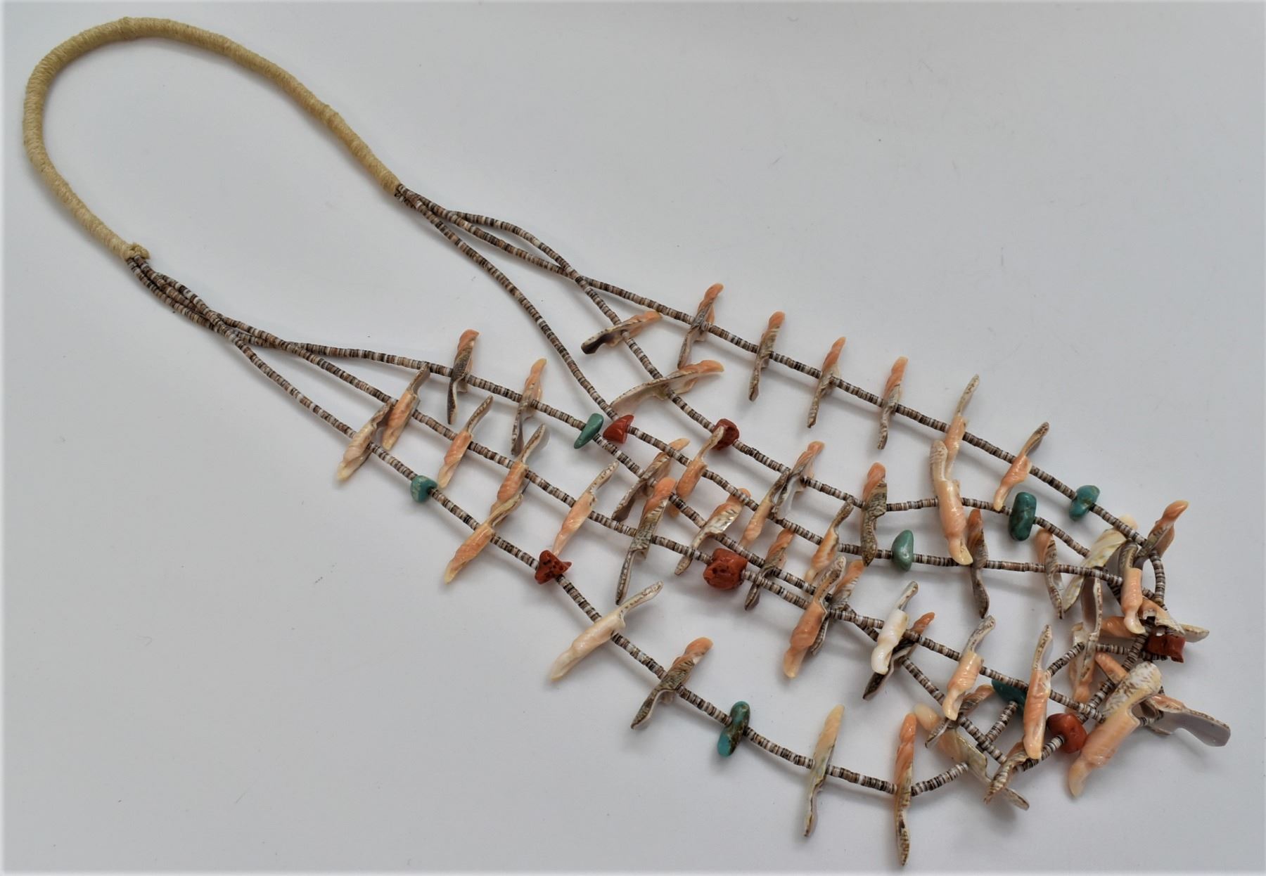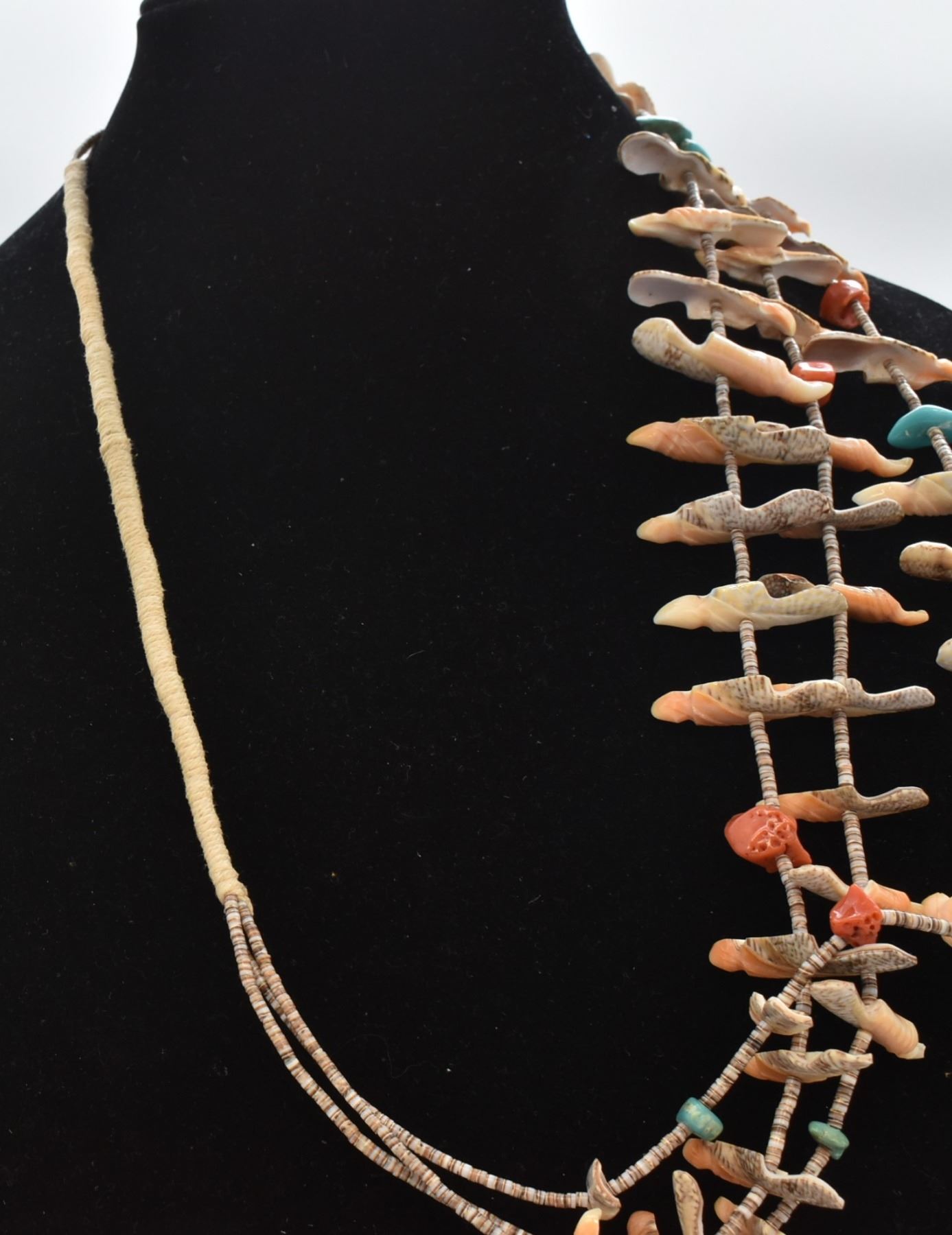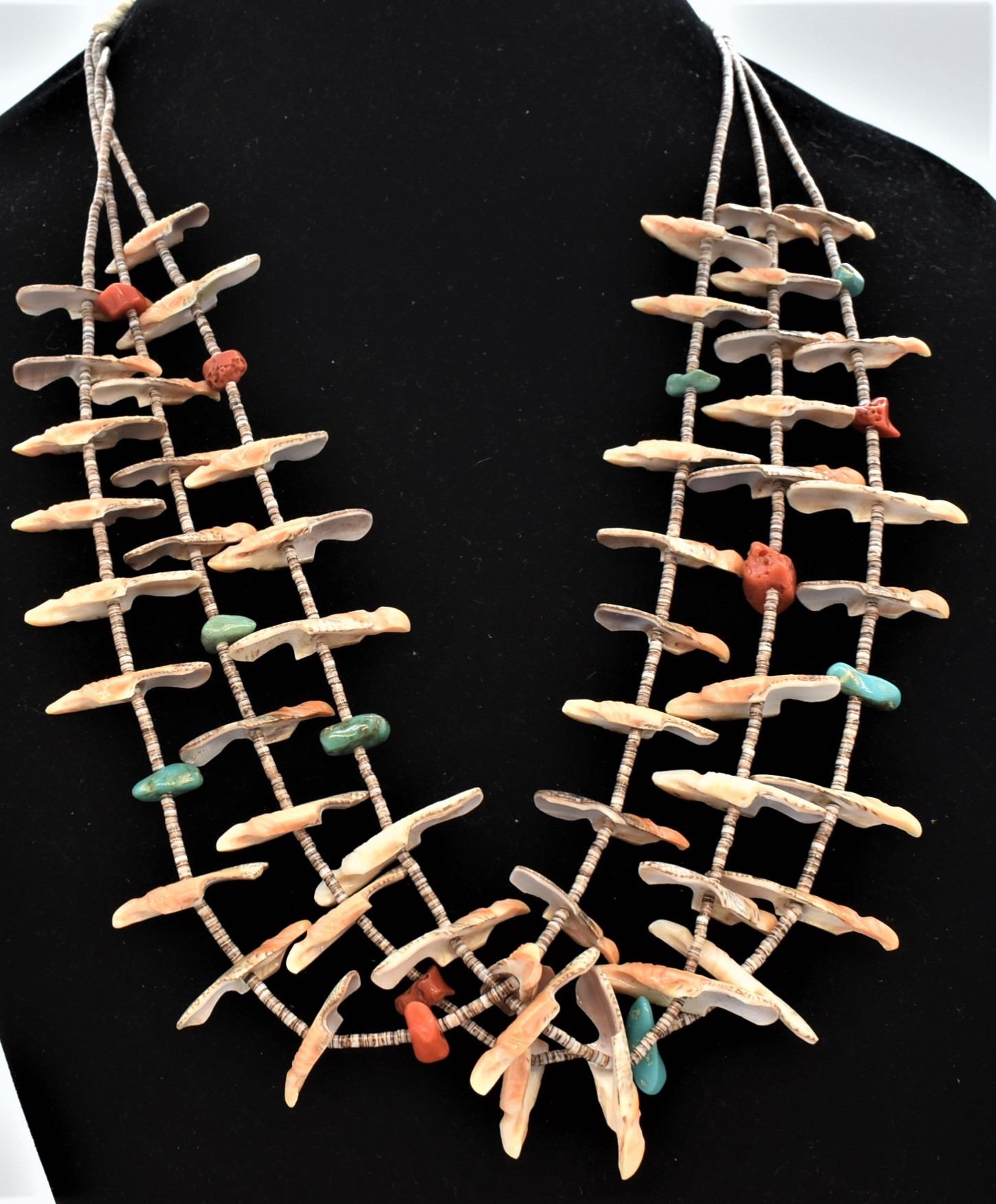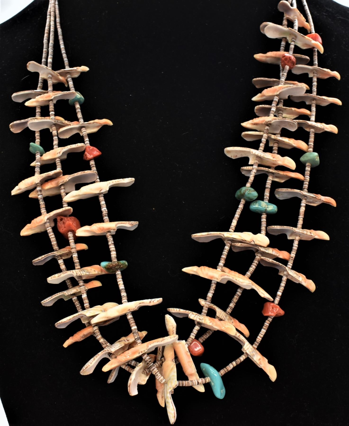 Santo Domingo 3 Strand Bird Fetish Necklace, measures 28''L end to end, features beautiful red shell bird fetishes, coral and turquoise nuggets, and fine shell heishi, stunning piece