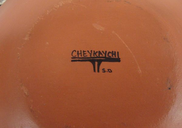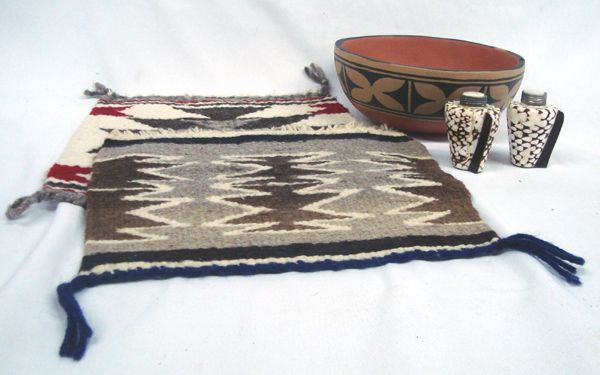 Santo Domingo Bowl, Navajo Rug Sampler & Shell S&P. Nice lot with Santo Domingo bowl, signed on the bottom ''Cheykaychi'', measures 8''x3''. The rug samplers are 12'' x 11.5'' and 10'' x 12''. The salt and pepper shakers are 2.75''H x 2.5''W.