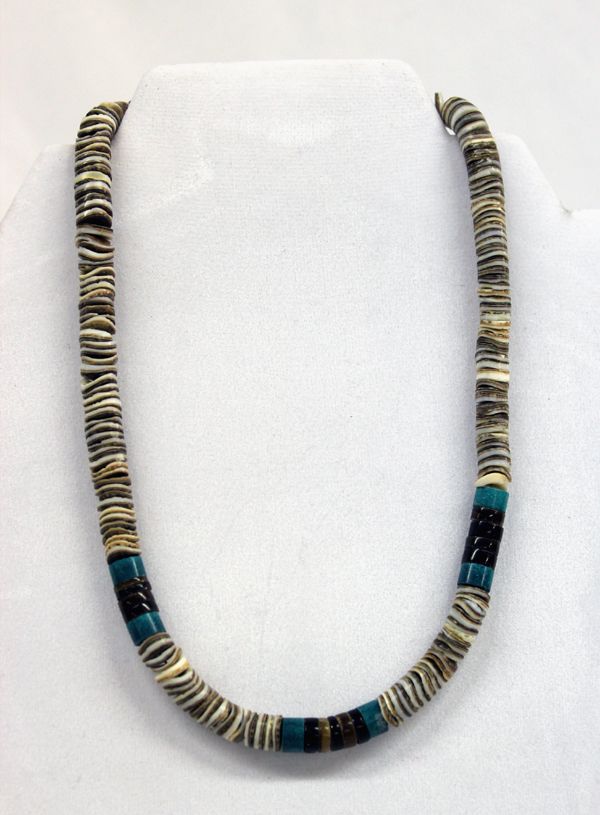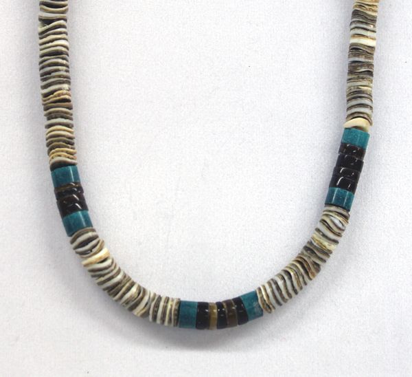 Santo Domingo Graduated Shell Heishi Necklace. Older piece of Santo Domingo Pueblo of graduated heishi beads, each end has a sterling bench made bead. Six large turquoise heishi beads provide the accent. Measures 16.5'', beads range from 1/4'' to 1/8''.