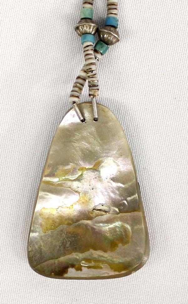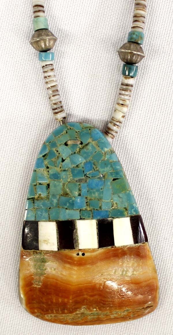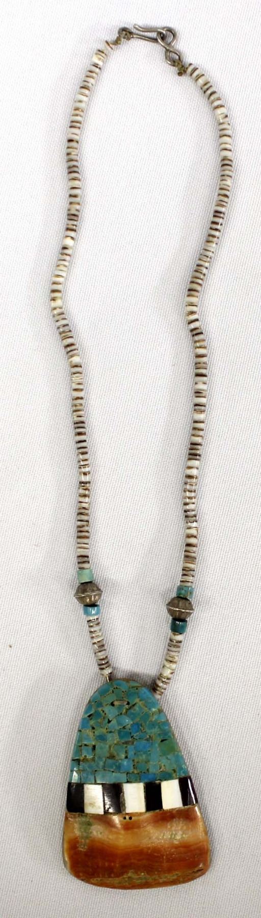 Native American Traditional Santo Domingo Heishi and Overlay Shell Pendant Necklace, measures 15''L end to end, pendant measures 2.5'' x 1.75'', overlay consists of small square turquoise pieces, red shell, jet, and white shell, sterling clasp