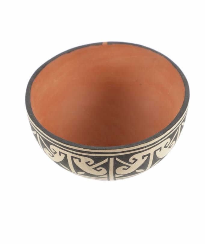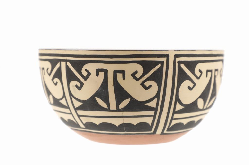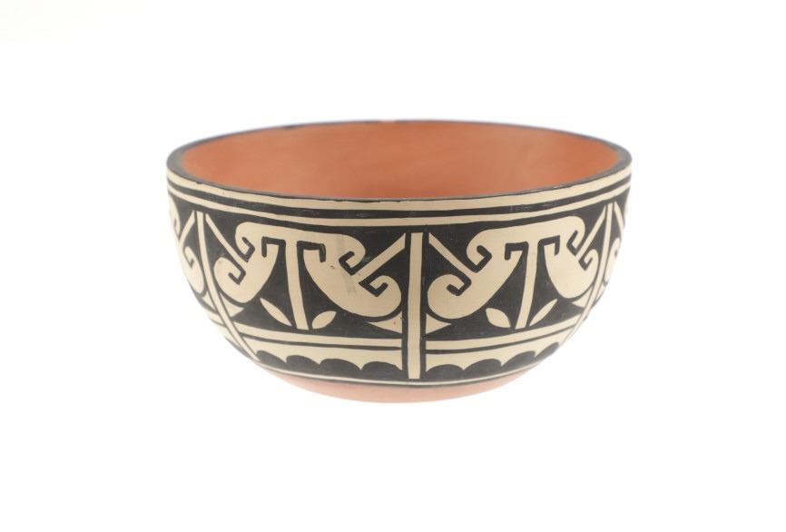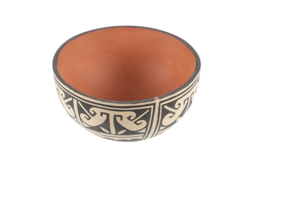 The lot features an original mid-to-late-19th Century Santo Domingo Pueblo (Kewa) polychrome painted pottery bowl from the Sundog Bruce VanLandingham collection. The piece is signed on the bottom “Louis M.T.Z S.D.P N.M”. SDP stands for Santo Domingo Pueblo and NM for New Mexico, making Louis M.T.Z likely being the artist name. The bowl shows a nice medium / medium-large size with expert geometric classic Kewa / Santo Domingo design in black and white / cream with a red slip base showing on the bottom and inside of the bowl. The piece is well kept with crisp paint and no apparent breaks. Provenance: From the renowned Sundog Fine Art Bozeman, Montana collection by Bruce VanLandingham. Bruce VanLandingham was a pillar in the American Indian collecting community and a respected expert. Along with being an avid collector, Bruce was also the sole owner of Sundog Fine Art Gallery in Bozeman, which was both part museum and gallery, this piece is directly from the collection. Measures 7” across / diameter by 3 3/8”H.