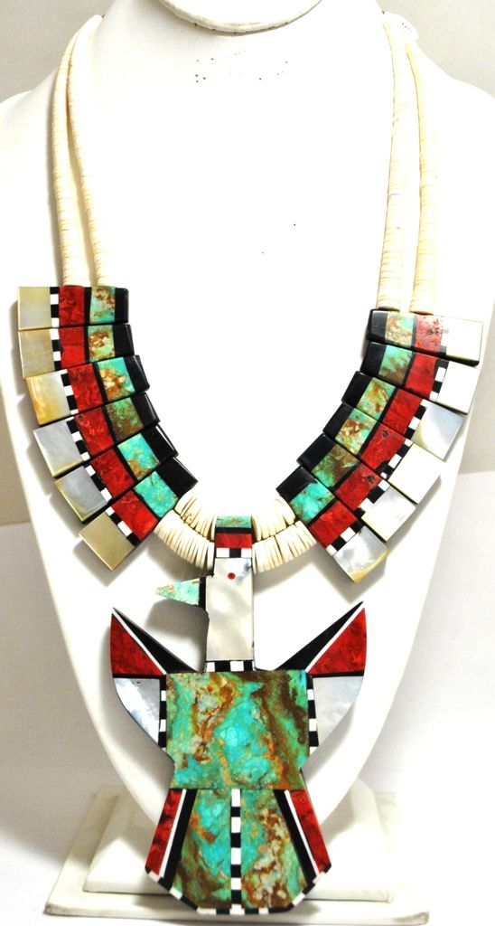 Tieable string measures 38" around. Bird pendant measures 5-1/4" tall by 3-3/8" wide.. Side pendants measure 1-3/4" tall by 5/8" wide. Stones Present: Shell, Spiny Oyster, Black Jet, Turquoise, Mother of Pearl.