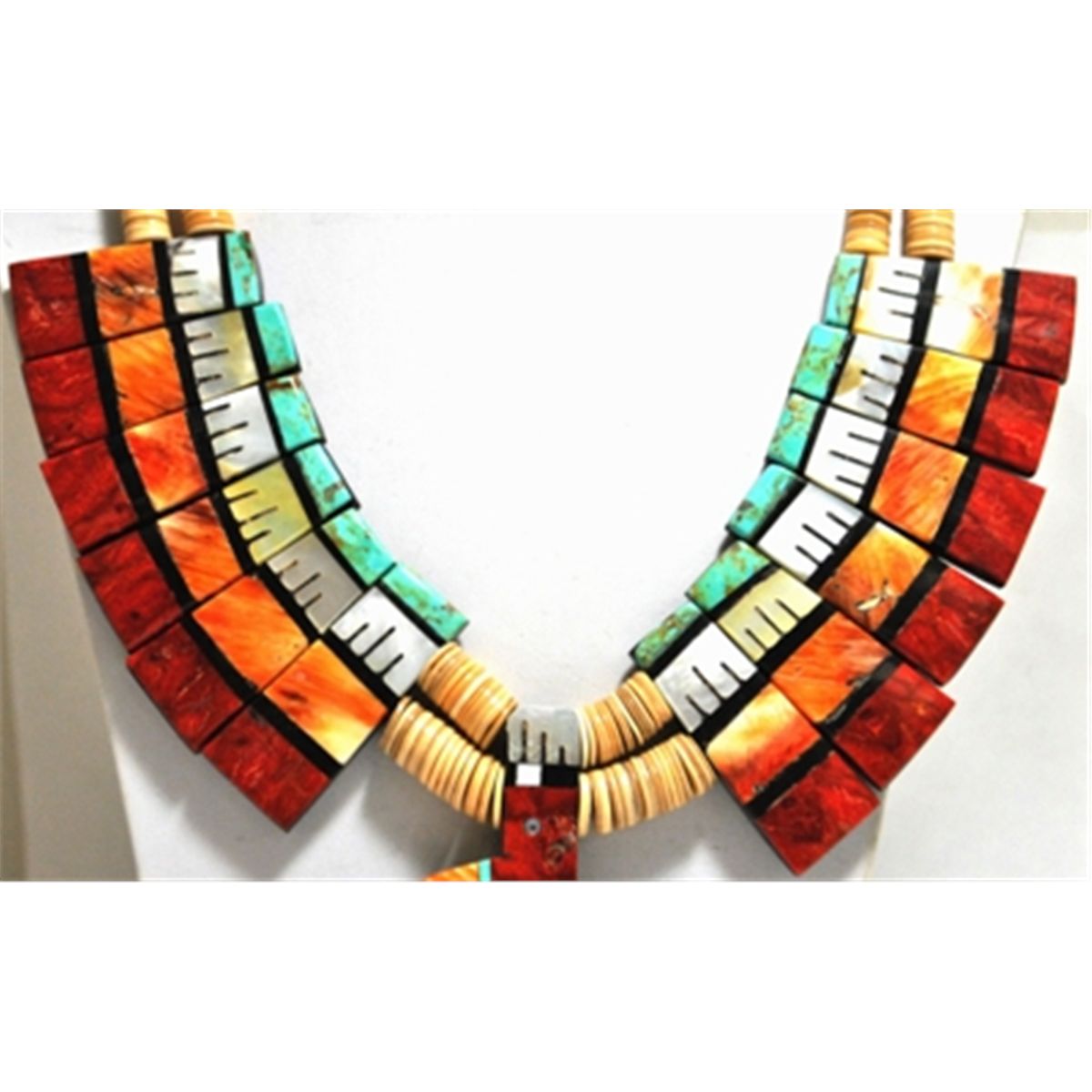 Tieable string measures 39" around. Bird pendant measures 3-3/4" tall by 2-1/2" wide. Side pendants measure approximately 1-3/4" tall by 3/4" wide. Stones present: Black Jet, Mother of Pearl, #8 Turquoise, Apple Coral, Orange Spiny Oyster, Shell.