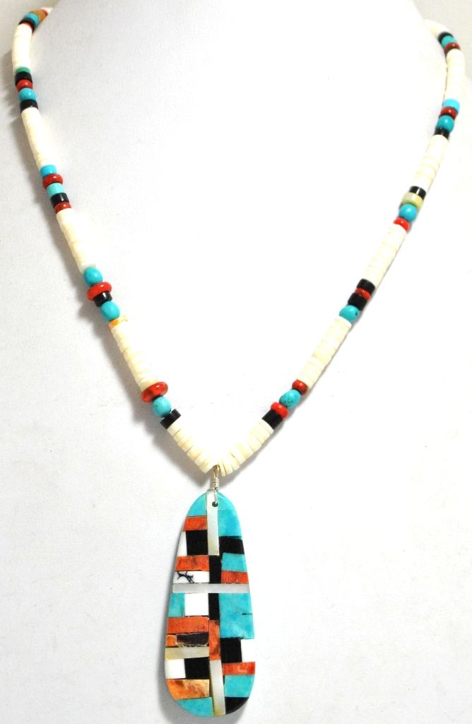 Measures 18" around by 3/16" wide. Pendant measures 2-1/2" tall by 7/8" wide. Stones present: Shell, Turquoise, Coral, Black Jet, White Mother of Pearl, Spiny Oyster.