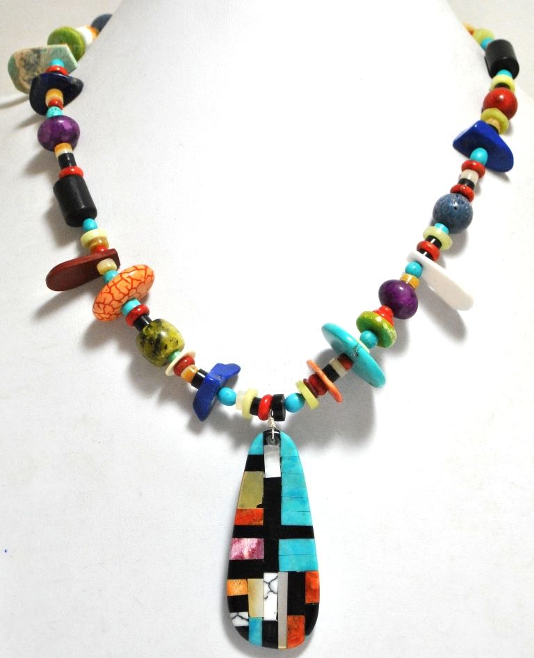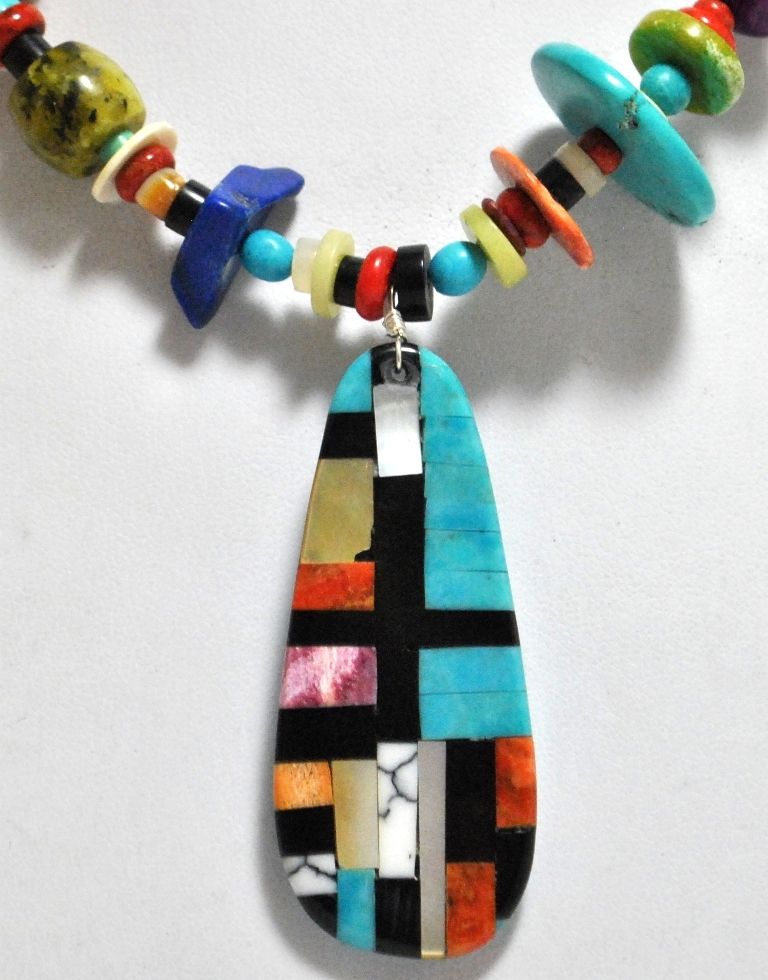 Measures 17" around by from 3/8" to 7/8" wide. Pendant measures 2-1/2" tall by 7/8" wide. Stones present: Apple Coral, Turquoise, Black Jet, White Mother of Pearl, Spiny Oyster, Sugilite, Lapis Lazuli, Denim Lapis, Shell.