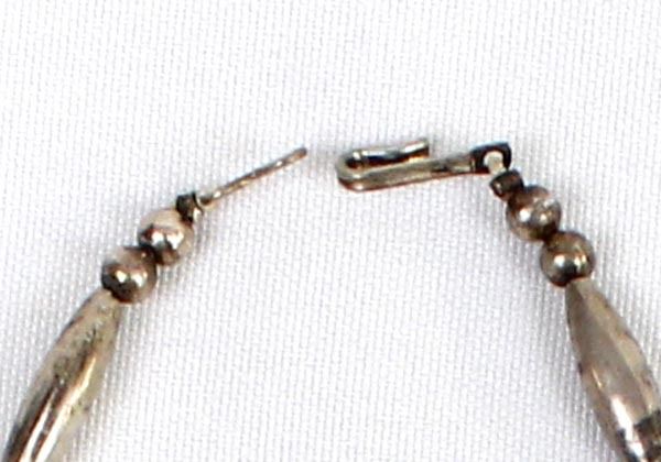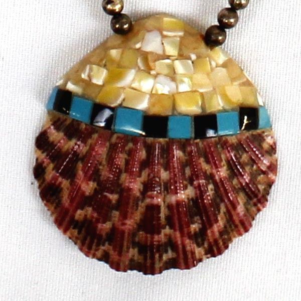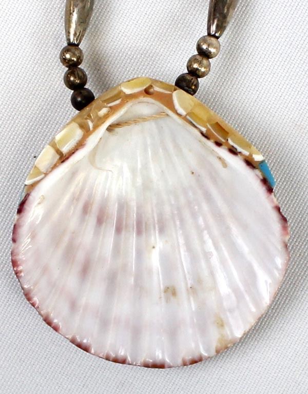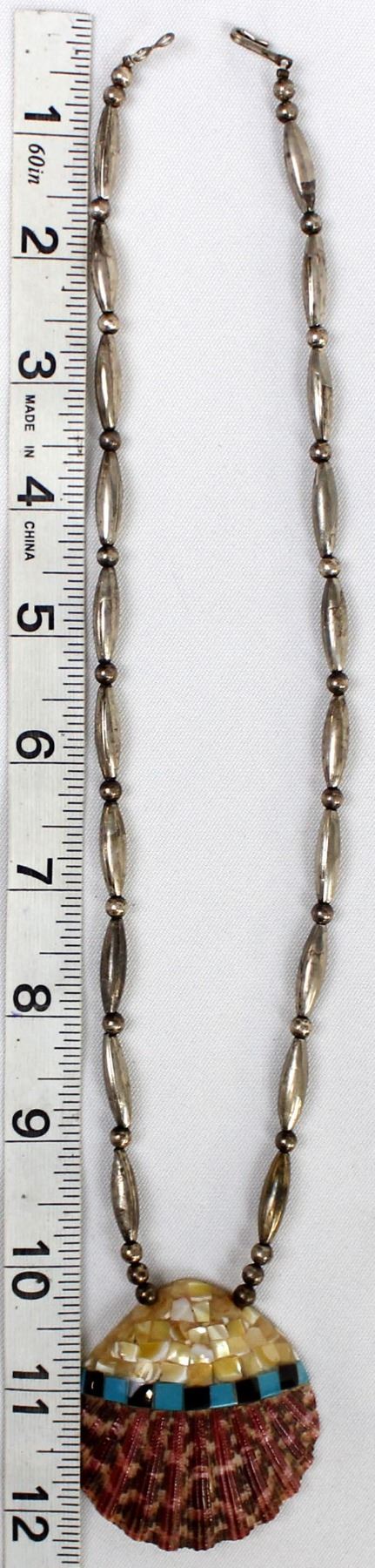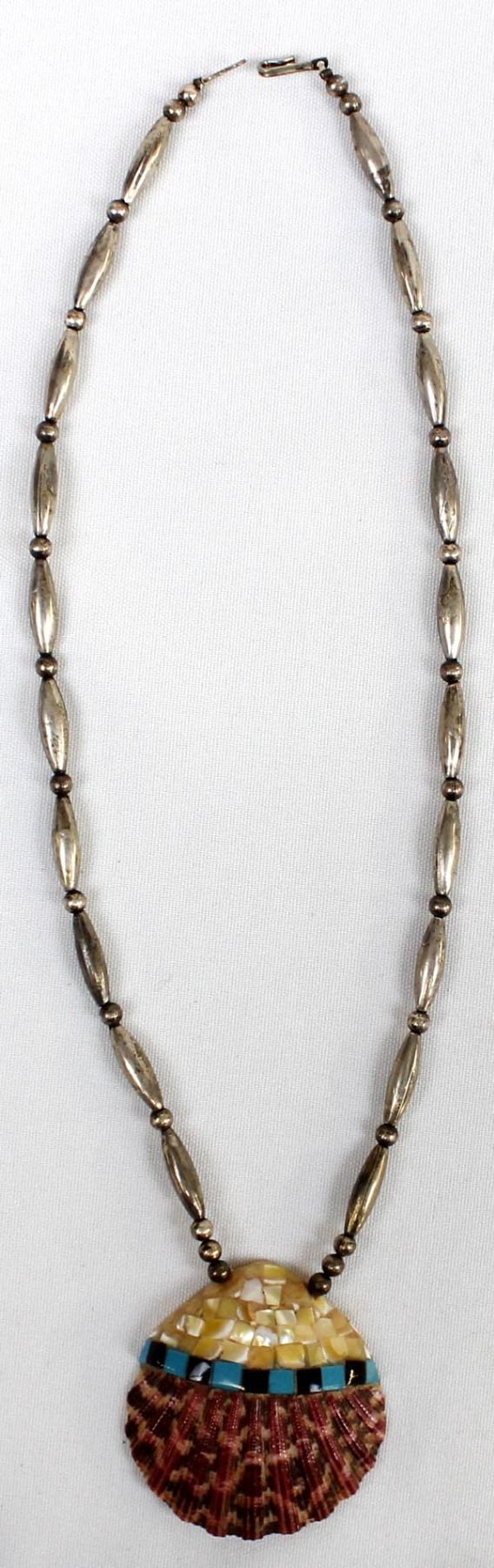 Native American Santo Domingo Overlay Shell Pendant Necklace, shell pendant measures 2.25'' x 2.5'', historic Navajo sterling cone bead necklace measures 20''L end to end