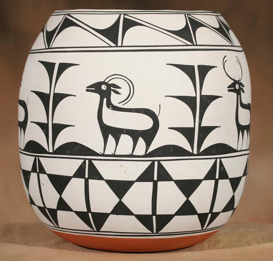 Santo Domingo Pot. 18 ½" x 18 ½". By Vidal Aguilar (b.1972). Hand painted vessel with deer & geometric designs. (est $2,000-3,000). For condition reports please visit: www.auctioninsantafe.com/cr2011.pdf