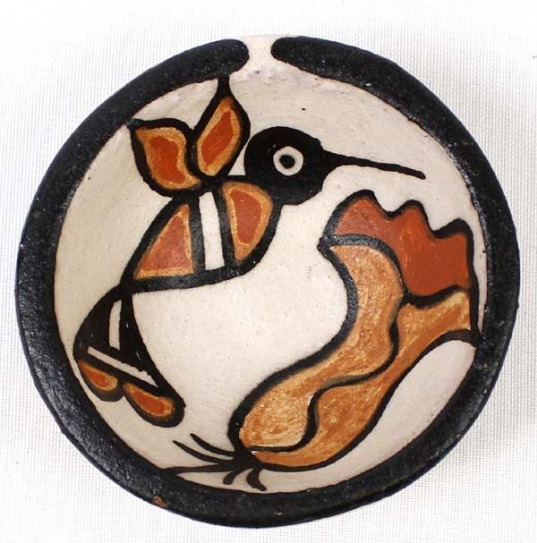 Native American Santo Domingo Kewa Pottery Hummingbird Bowl by Rose Pacheco (b. 1968), measures 1.5'' x 3.5'' and is signed on the bottom, FYI: Rose has been actively making pottery since the late 1970's even though she was born in 1968. Although her works are considered contemporary, Rose describes herself as a traditional potter.''