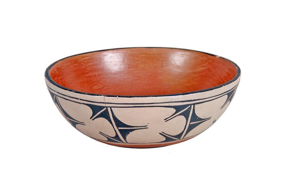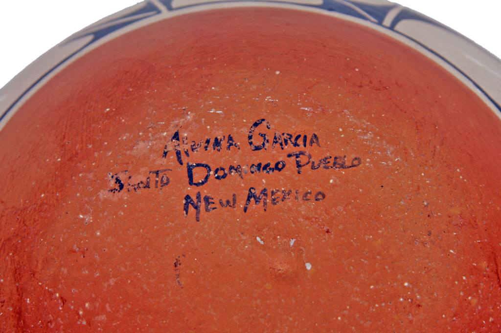 Santo Domingo Pueblo Bowl Signed on bottom "Albina Garcia", from New Mexico, has polychrome finish, in overall good condition with one 2" hairline crack, measures 9 1/2" diameter and approx 3" high.Signed on bottom "Albina Garcia", from New Mexico, has polychrome finish, in overall good condition with one 2" hairline crack, measures 9 1/2" diameter and approx 3" high.