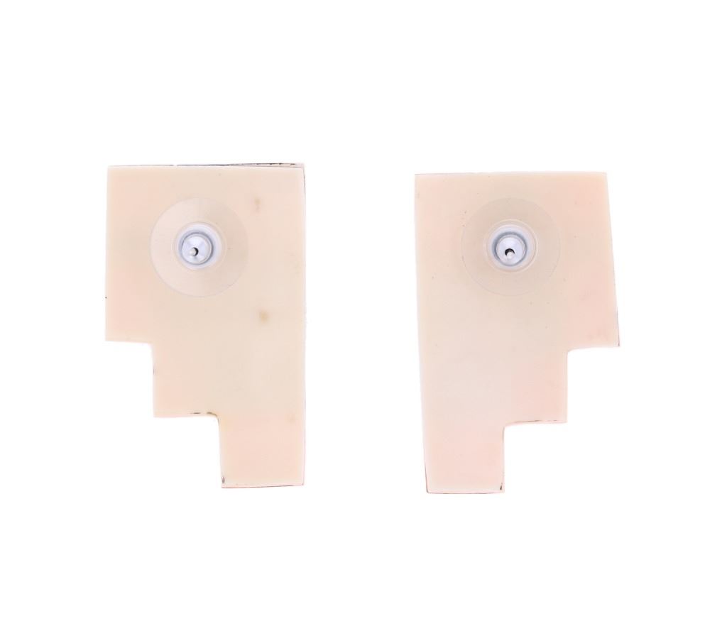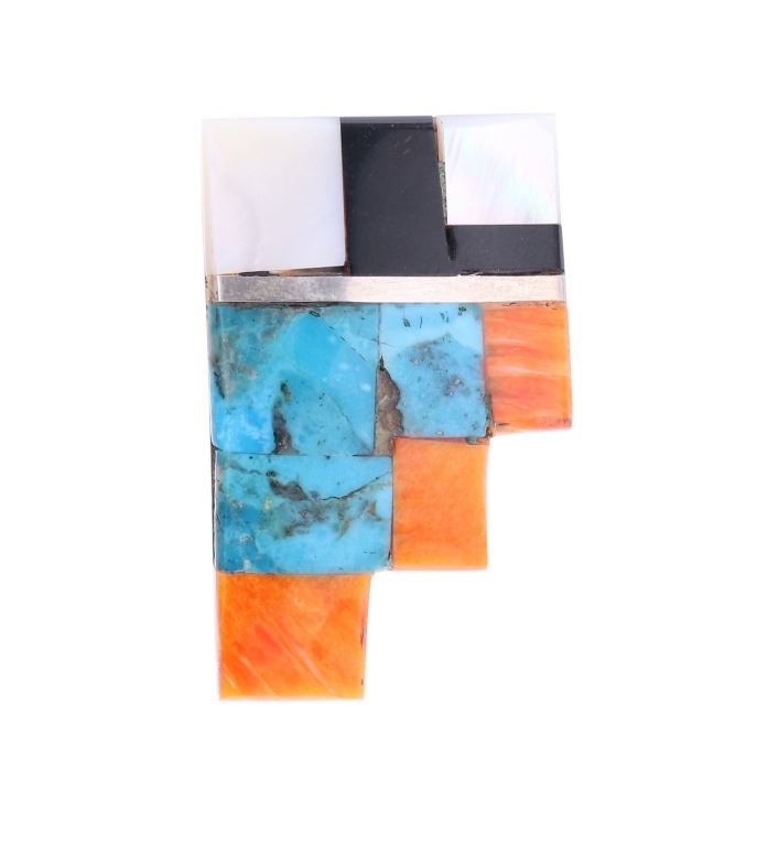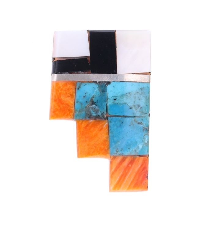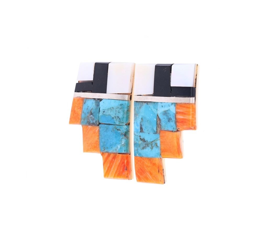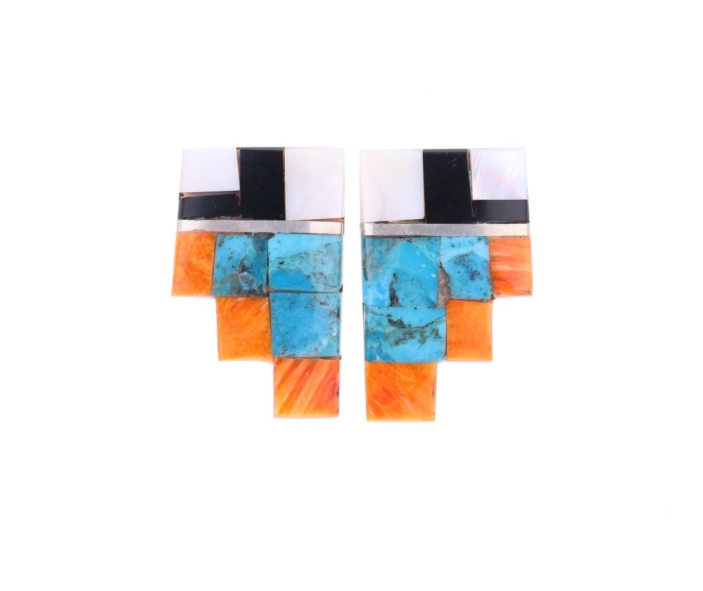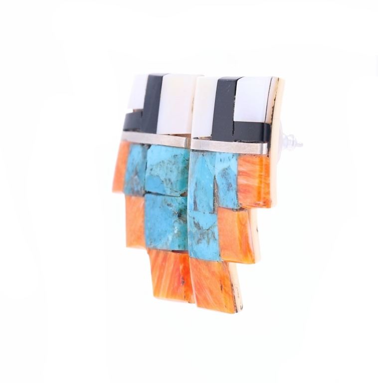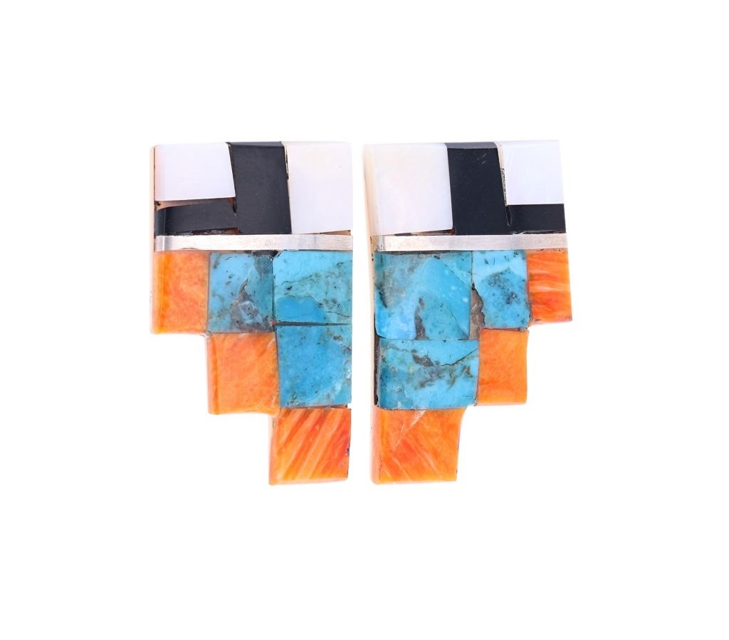 Featured in this lot is this Santo Domingo Pueblo stepped inlaid earrings. The earrings feature a wonderfully and professionally crafted shell and multistone construction and sterling silver stub earring back. The stepped design is inlaid with orange spiny oyster, Blue Gem Turquoise, jet, and mother of pearl. The condition of this pair of Santo Domingo Pueblo earrings is good with no obvious signs of damage and shows good overall condition. The measurements of this pair of earrings is 1 1/2" x 7/8" x 5/8". The collective weight of this pair of earrings is 13.1g.