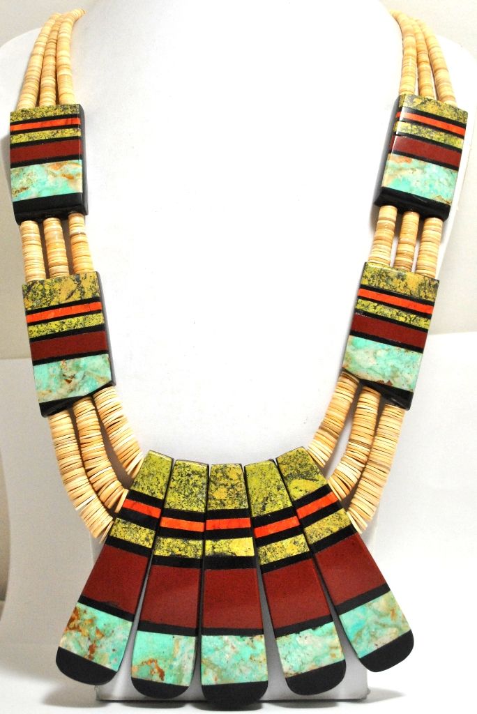 Measures 40" around maximum with tieable string. Has three shell heishi strands measuring from 3/16" to 1/2" wide. Center pendant measures 3-3/4" tall by 1" wide. Side center pendants measure 2-1/8" tall by 1-1/4" wide. Side top pendants measures 2" tall by 1-1/4" wide. Stones present: Turquoise, Black Jet, Shell, Spiny Oyster.