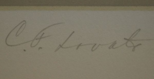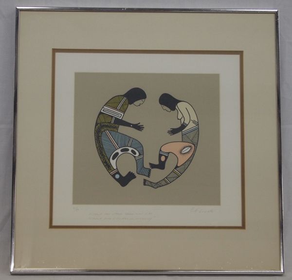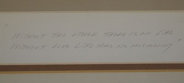 From the Tucson, Arizona Collection. Santo Domingo Charles F. Lovato (1937-1987) Signed & Numbered Silkscreen Print 71/80 and reads ''Without the other there is no life Without love life has no meaning'', numbered in the lower left corner and signed in lower right corner measures 11.5'' x 14 1/8'', triple matted and framed, Artist Bio: ''Kewa Pueblo (Santo Domingo) is known mostly for its fine heishi jewelry and excellent pottery, but not many painters are known from there. Charles Lovato is probably the finest and most recognized painter from that pueblo. It is unfortunate that he had such a short life, but fortunate that he left behind some wonderful paintings. Lovato's paintings were often inspired by poetry and at other times poetry was inspired by his paintings. His work took on a somewhat abstract depiction of representational figures.''