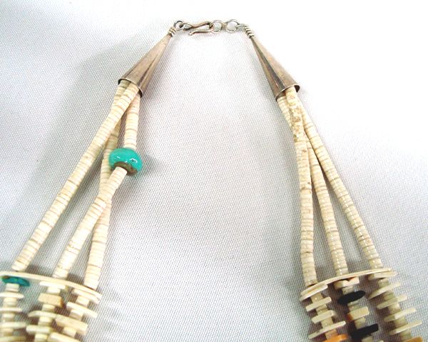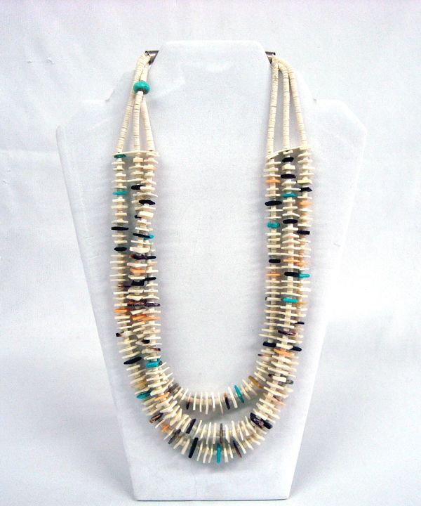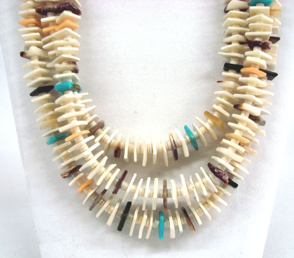 Santo Domingo Three Strand Necklace. Various colors of shell square cut beads with turquoise used as accents. In between each bead are shell heishi which are singly strung into the divider to the cone. Stylish piece of Santo Domingo craftsmanship. Measures 24''.