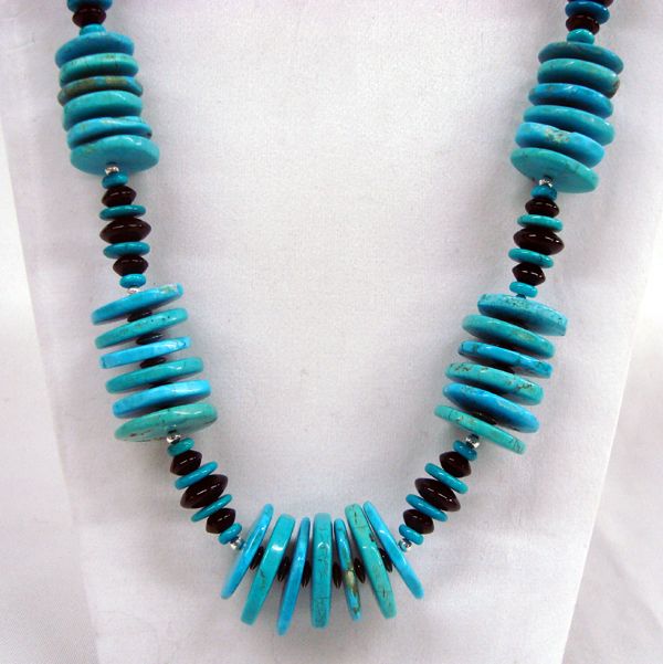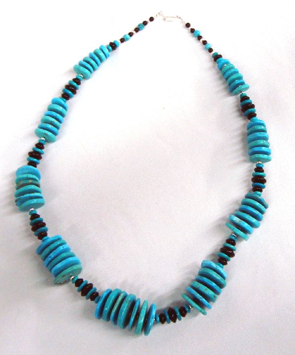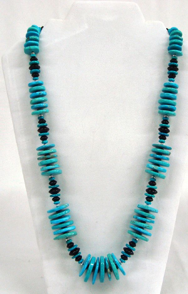 Santo Domingo Turquoise & Jet Necklace, Signed. Beautiful large turquoise disc beads, largest measures 1''. Strung with black jet beads, measures end-to-end 26 3/4'', signed by artist, Tauni Terico.
