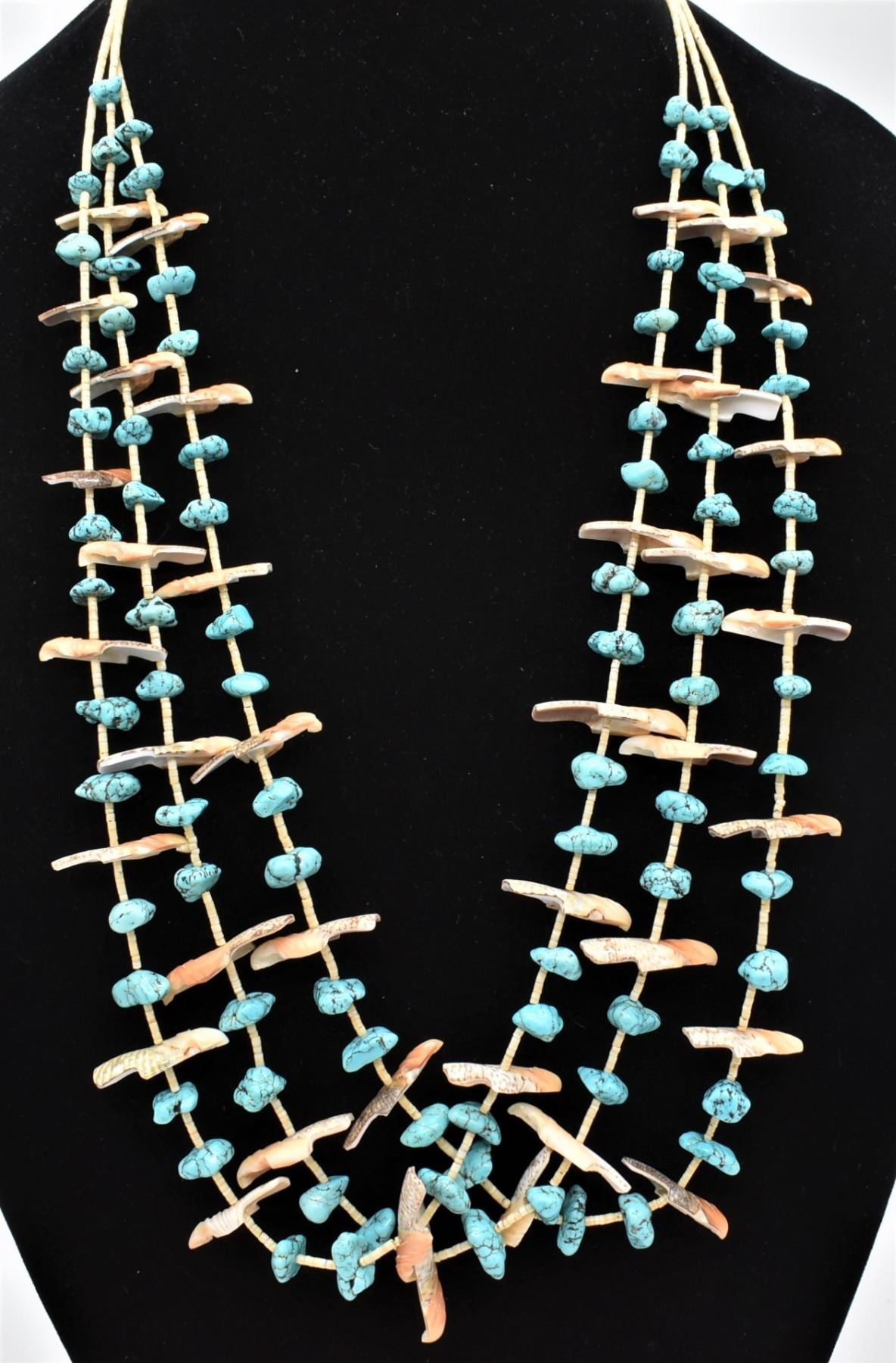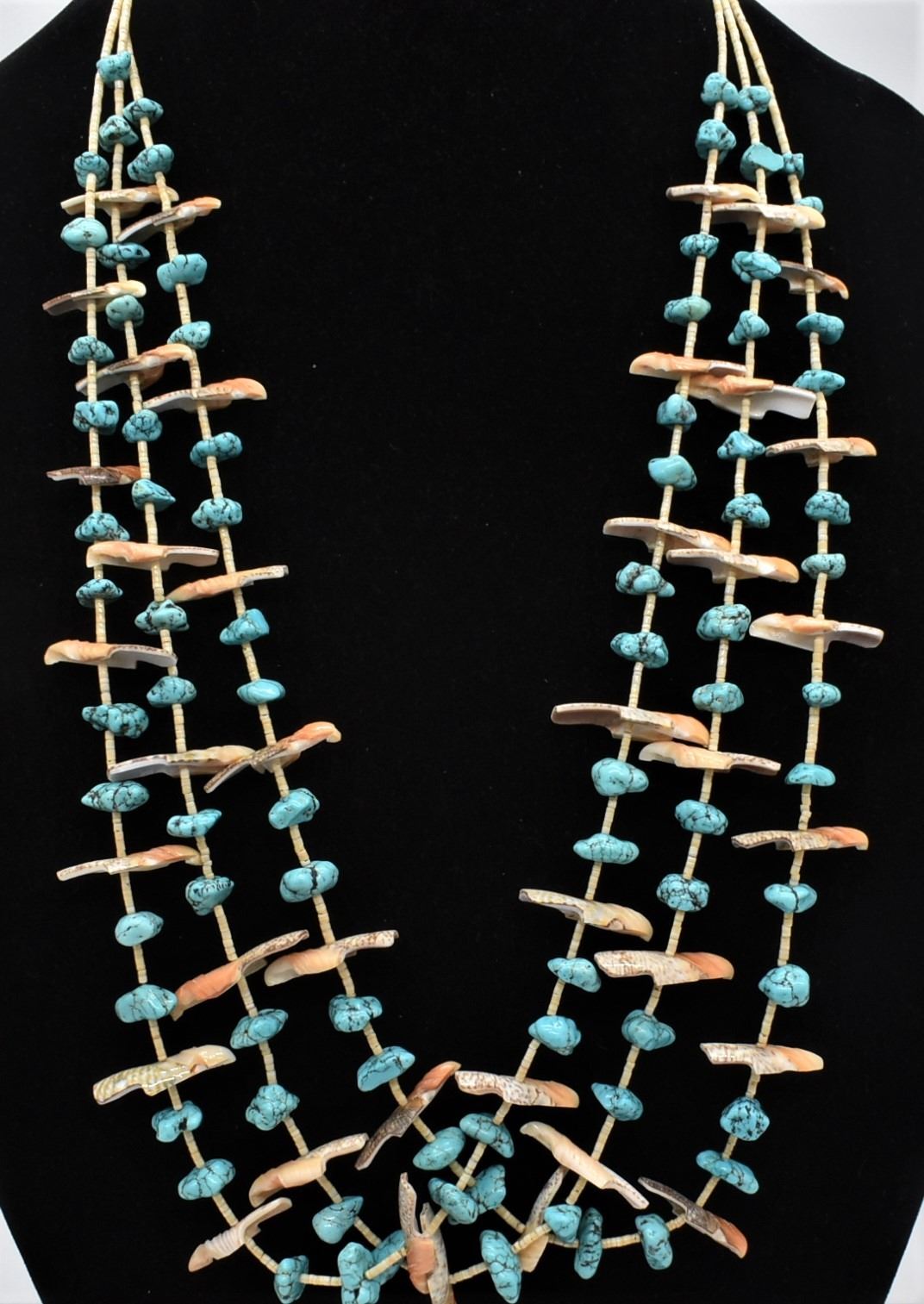 Native American Santo Domingo Turquoise Nugget and Bird Fetish Necklace, measures 28''L end to end, features beautiful fine orange shell heishi beads, absolutely gorgeous