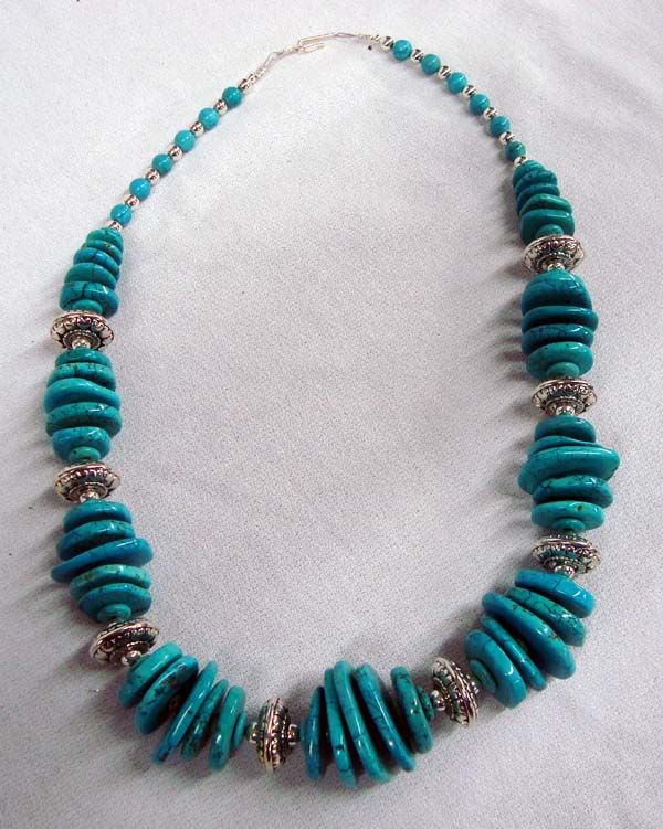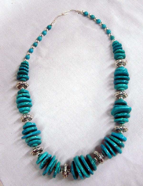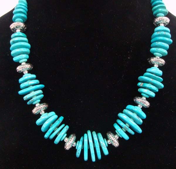 Native American Santo Domingo Turquoise and Silver Necklace. Beautiful groupings of graduated size turquoise discs separated by silver beads with stamped designs. Each group of beads is graduated size and the groups graduate in size to the tips where there are silver ball beads and turquoise ball beads. Necklace is 24'' end to end and the largest bead is 1-1/8''Lx7/8''W.