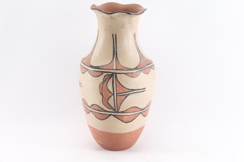 Redware vase with red, black and white geometric design. Overall very good condition. Measures 14" x 9". From the Steve Goldstein Collection, Scottsdale, AZ.