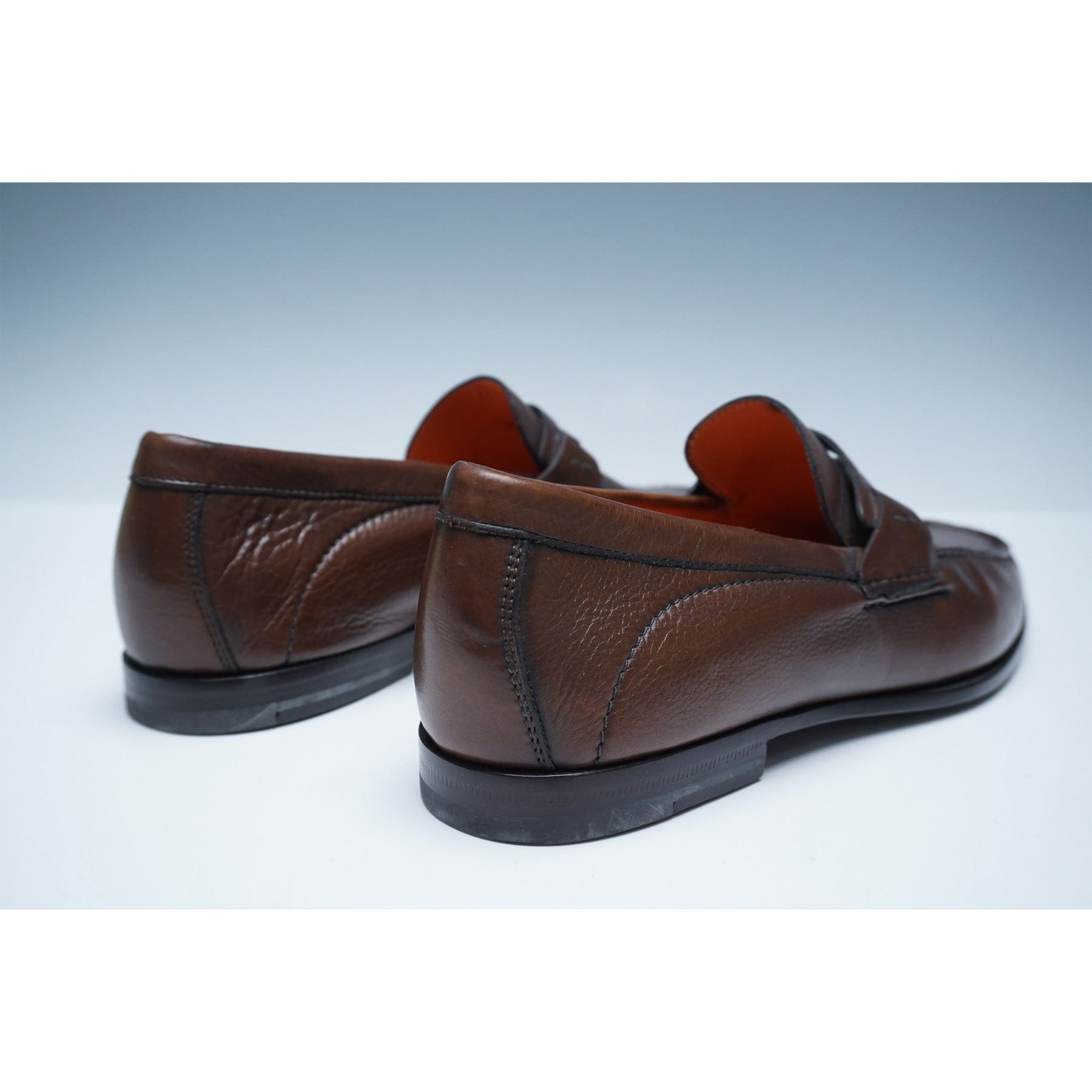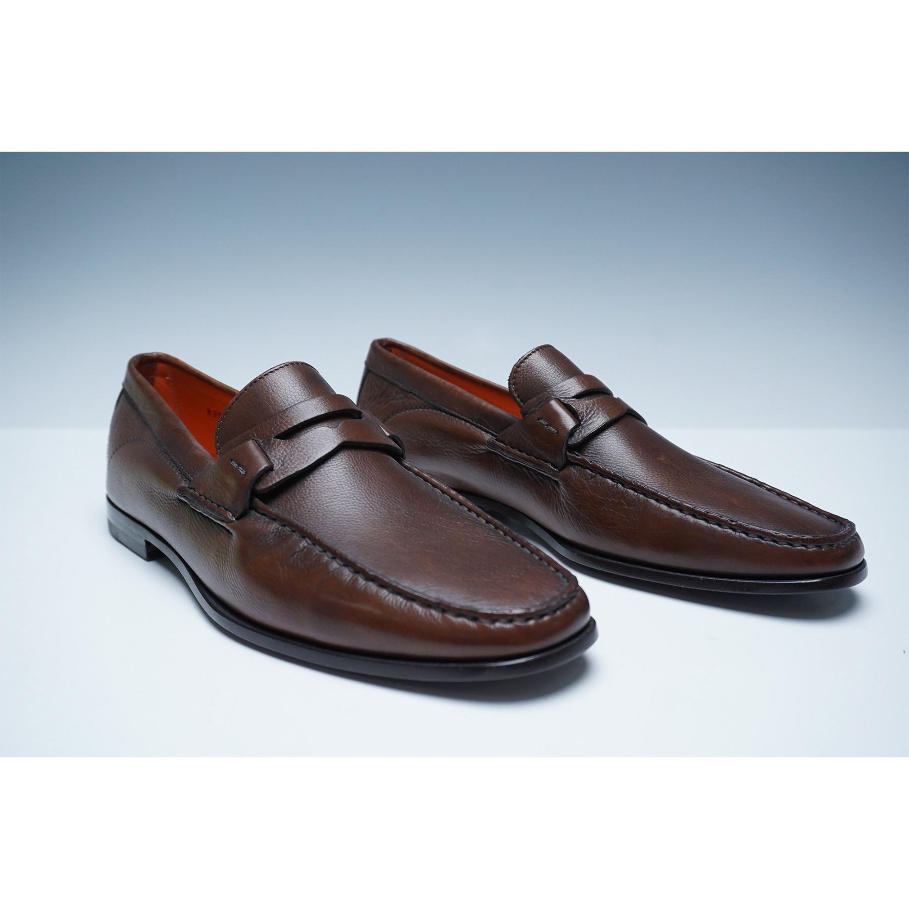 This loafer pays homage to Santoni's artisanal heritage and modern styling. Crafted from hand-polished leather in line with our age-old artisanal techniques, it's finished with raised apron stitching and a characteristic saddle strap. An orange sole and matching lining add an instantly recognizable graphic touch. Brown color, size 7.5M.