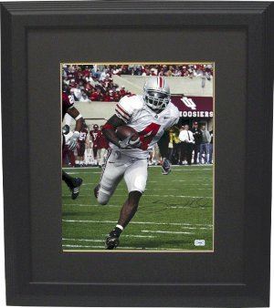Santonio Holmes attended Ohio State University where he was red shirted when Ohio State won the 2002 national Championship. Holmes caught 245 passes for 2,295 yards and 25 touchdowns, while gaining 3,123 all-purpose yards. His 240 career receptions and 3,496 yards ranked were the fifth totals highest in school history at the time. His 25 touchdown catches ranked him 3rd. Santonio Holmes has hand autographed this Ohio State Buckeyes 16X20 Photo. Custom Black Mat and Black Color Framed as shown. Holmes Hologram and Certificate of Authenticity from Athlon Sports.
