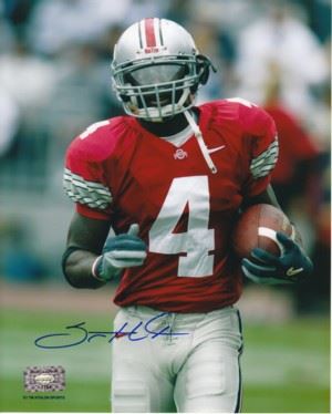 Santonio Holmes attended Ohio State University where he was red shirted when Ohio State won the 2002 national Championship. Holmes caught 245 passes for 2,295 yards and 25 touchdowns, while gaining 3,123 all-purpose yards. His 240 career receptions and 3,496 yards ranked were the fifth totals highest in school history at the time. His 25 touchdown catches ranked him 3rd. Santonio Holmes has hand autographed this Ohio State Buckeyes 16X20 Photo. Holmes Hologram and Certificate of Authenticity from Athlon Sports.