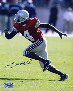 Santonio Holmes attended Ohio State University where he was red shirted when Ohio State won the 2002 national Championship. Holmes caught 245 passes for 2,295 yards and 25 touchdowns, while gaining 3,123 all-purpose yards. His 240 career receptions and 3,496 yards ranked were the fifth totals highest in school history at the time. His 25 touchdown catches ranked him 3rd. Santonio Holmes has hand autographed this Ohio State Buckeyes 16X20 Photo. Holmes Hologram and Certificate of Authenticity from Athlon Sports.