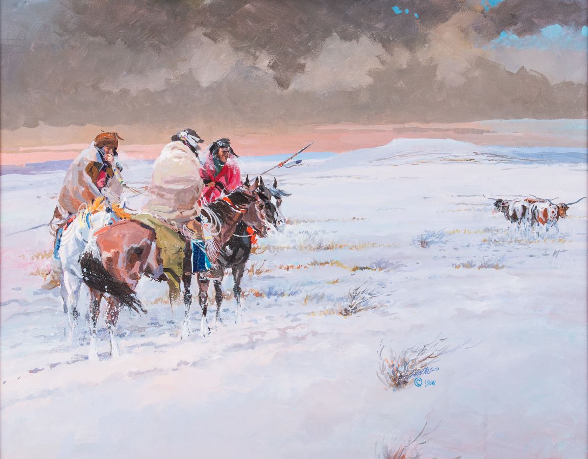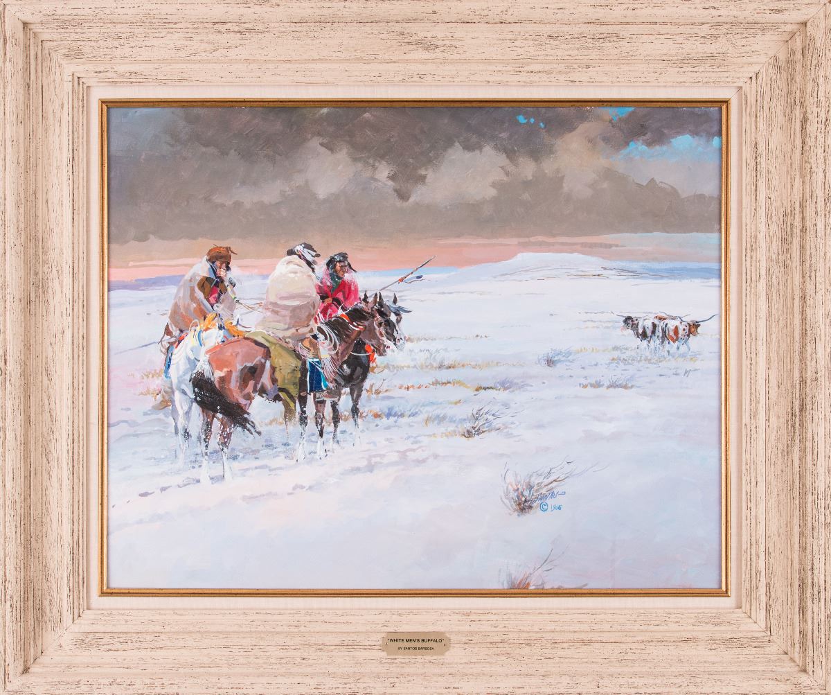 Santos Barbosa (1946 - ).White Men's Buffalo. 22" x 28" acrylic on board. Signed and dated '86 lower right. Verso: Titled, signed and dated 1986.
