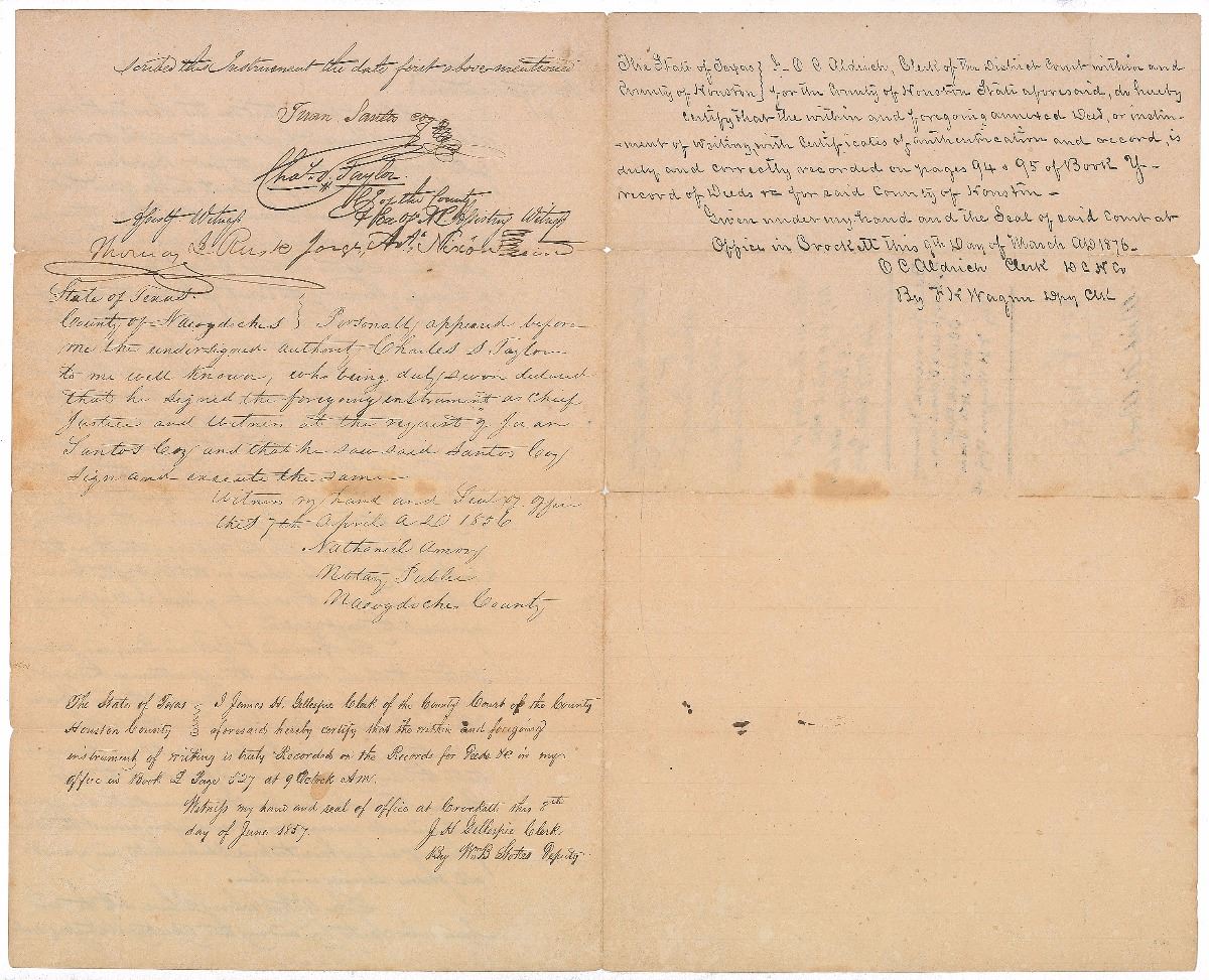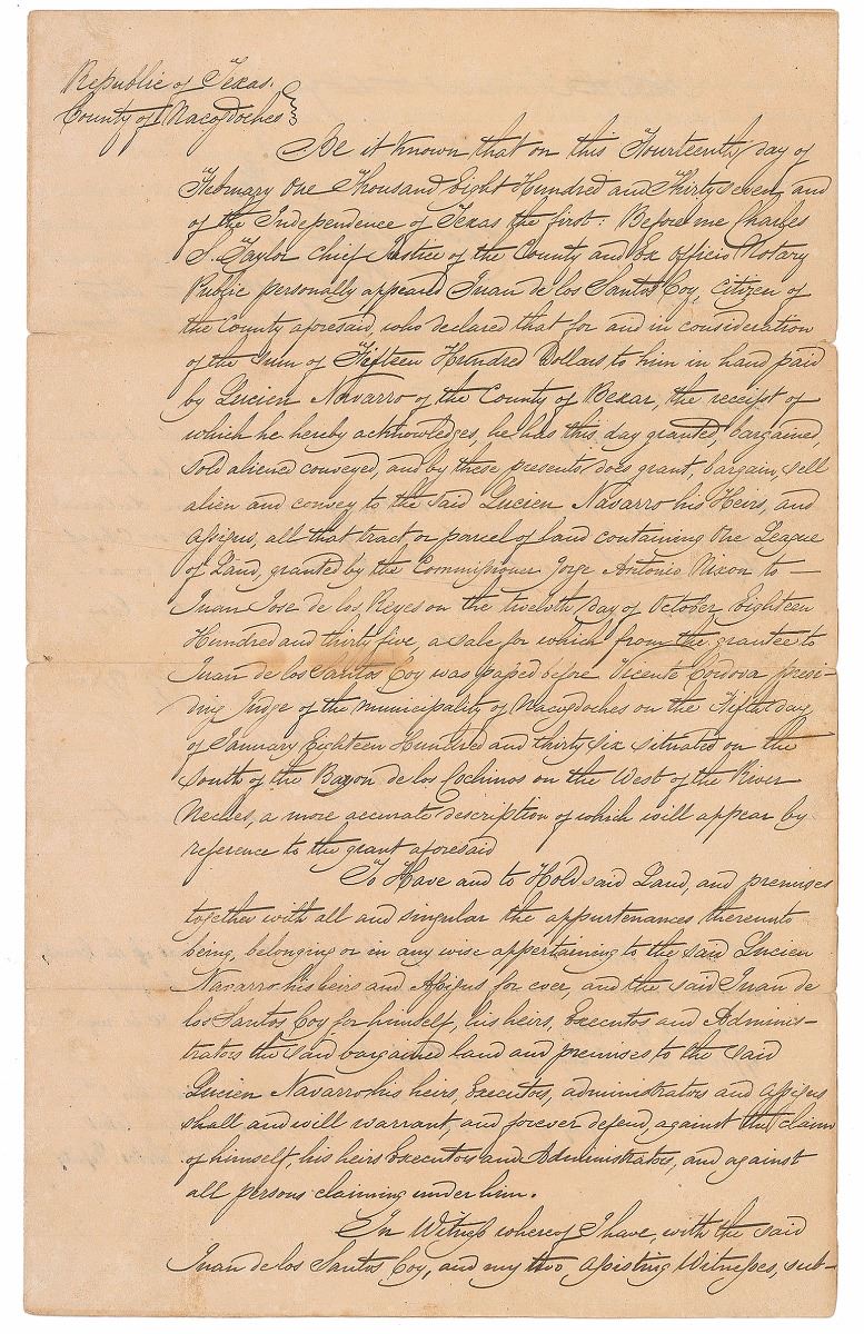 Manuscript DS, signed “Juan Santos Coy,” three pages on two adjoining sheets, 7.75 x 12.5, February 14, 1837. Deed from Santos Coy to Lucien Navarro, in which Coy, “in consideration of the sum of Fifteen Thousand Dollars to him in hand...hereby acknowledges, he has this day granted, bargain, sold, aliened, conveyed...all that tract or parcel of land containing the League of Land, granted by the Commissioner Jorge Antonio Nixon.” Signed at the conclusion by Juan Santos Coy, Charles Taylor as clerk, and witnesses Thomas J. Rusk and Jorge Antonio Nixon. In very good condition, with partial separations to folds, overall toning, and scattered staining. Provenance: The Robert Davis Collection.