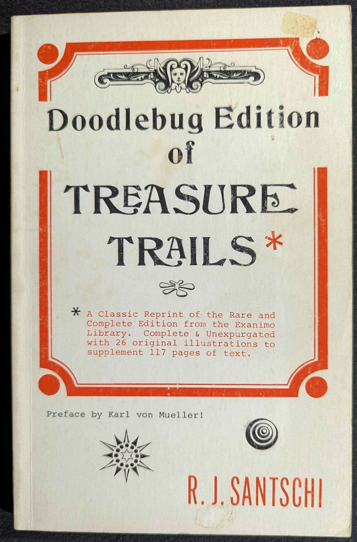 Santschi, R.J. TREASURE TRAILS. WITH EXTRACTS FROM MYSTERIES OF TREASURE HUNTING. Exanimo Press. 1973. 12mo. (4), 117, (1) pages. Segundo. reprint edition. original white printed card covers. illustrated. Very Good. This book is one of the classic works on the divining rod covering principals and use. It is the Exanimo Express (KvonM) reprint of the rare and complete edition from the Exanimo Library. Complete and unexpurgated with 26 original illustrations to supplement 117 pages of text. Too much cannot be said about the author, R. J. Santschi, and it is unfortunate that his books have never been reprinted in volume for the benefit of all treasure enthusiasts. Very scarce in both the original and reprint hardcover editions, this paperback reprint is becoming difficult to locate. Lot weight: 0 lbs 6oz. Subject(s): Treasure Hunting.