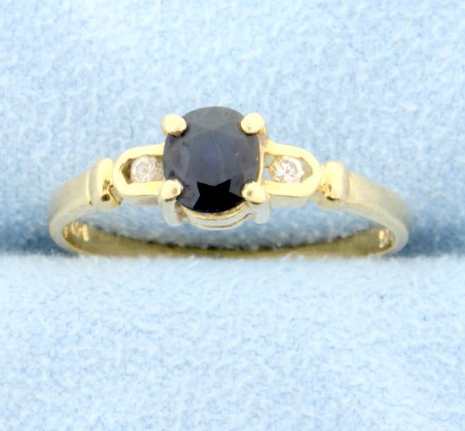 The sapphire is a 5mm x 4mm oval stone! There are 2-diamonds that weigh a total of 0.03 cts, and channel set. Size 7. 2.2g