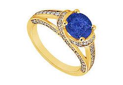A round deep blue sapphire is wrapped up by two swirling rows of smaller diamonds. Other diamonds are prong-set in two side rows. Made in 14K yellow gold this ring has a total weight (TGW) of 1.00 ct.