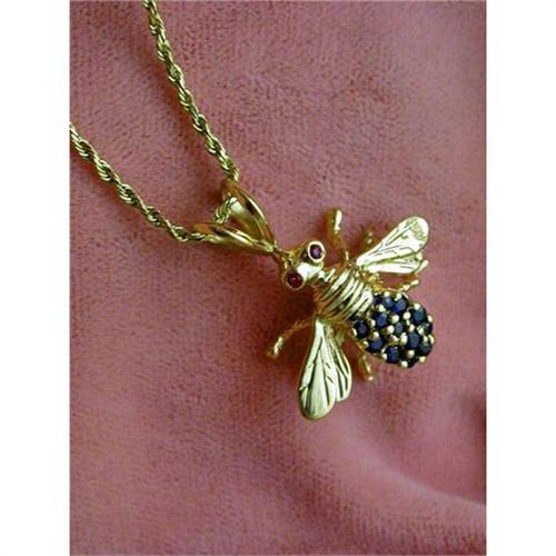 14K YG Pendant in Bee Shape with Sapphire Body and ruby Eyes. The sapphires have a beautiful cobalt blue color. Shapes from nature are very fashionable right now. It also comes with 14K YG Nice Rope Chain which is 22" Long. Very Striking pendant and will be noticed and what a way to show your September birthstone!!