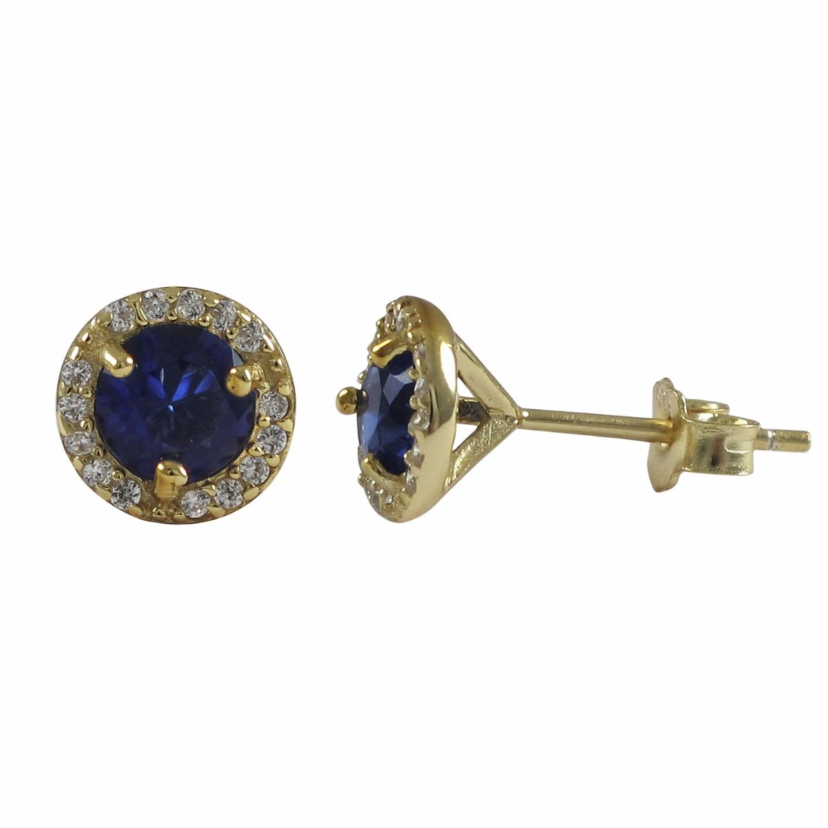 Sapphire Blue 5Mm Round CZ With White CZ Border, Gold Plated Sterling Silver 8Mm Round Post Stud Earrings