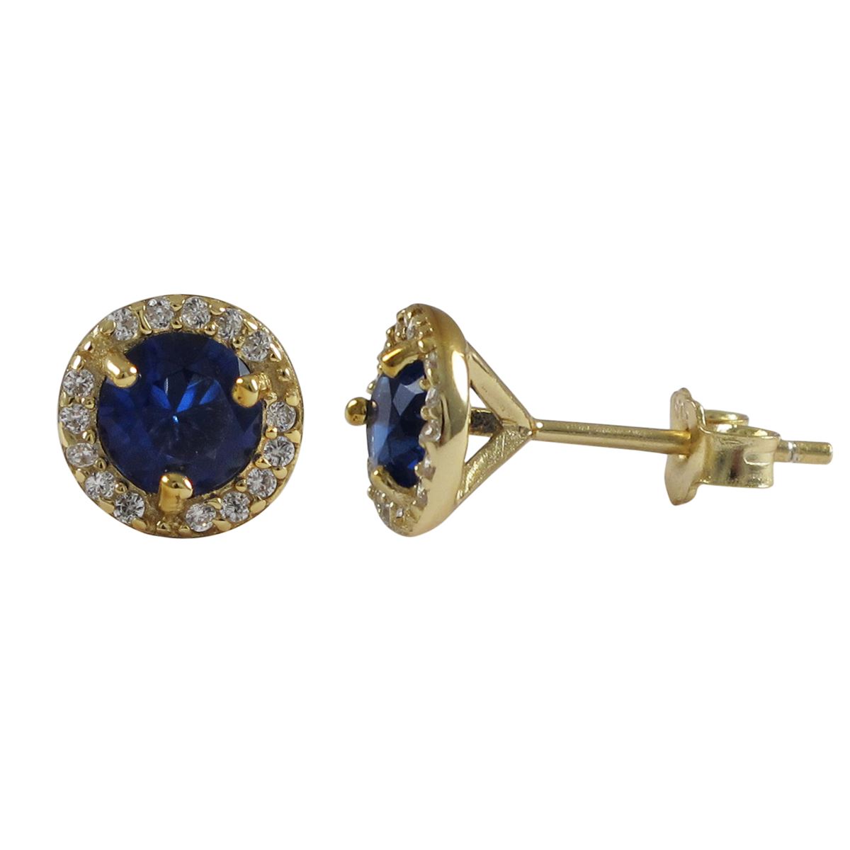 Sapphire Blue 5Mm Round CZ With White CZ Border, Gold Plated Sterling Silver 8Mm Round Post Stud Earrings