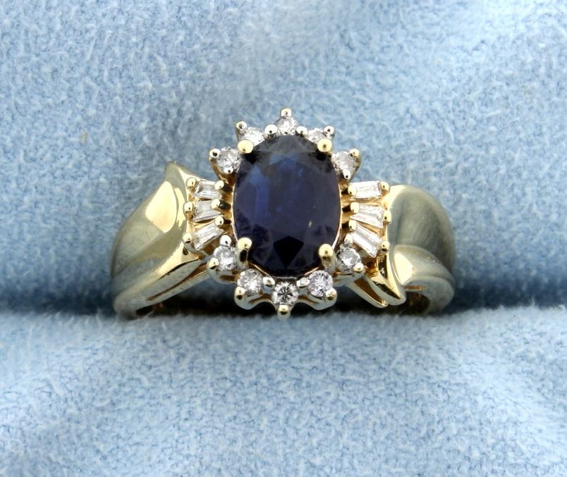 The gem sapphire is 7.8mmx5.75mm oval. Approx. weight 1.35 carats. There are 10 brilliant cut diamonds and 6 taper baguettes. Total diamond weight 1/4 carat. Clarity SI-I1, color I-J-K. Size 6.5. 3.3g