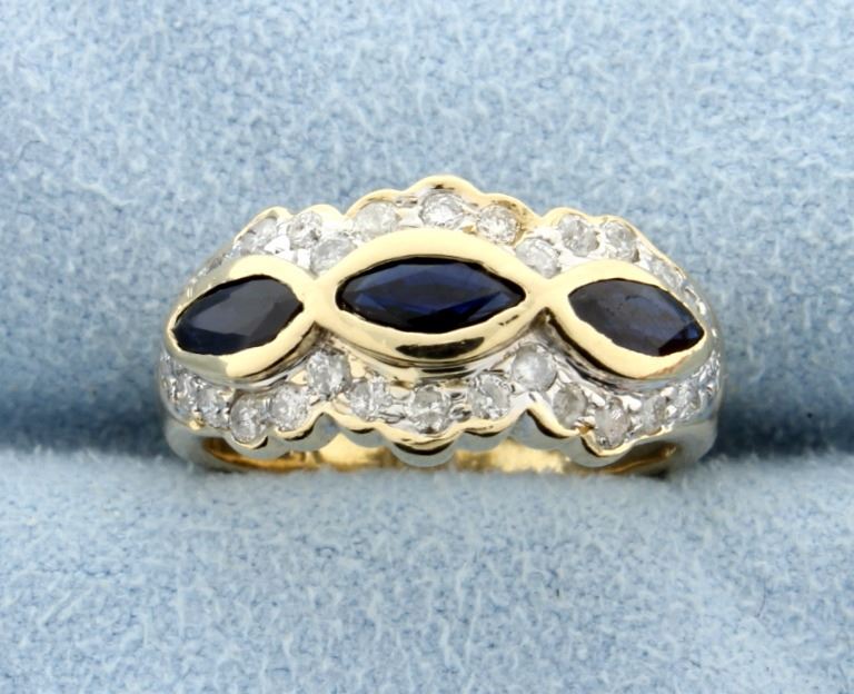 There are 3 marquise 6mmx3mm approx. 0.90 carat total weight with 28 brilliant cut diamonds (approx. 0.50 carat total weight). Clarity of diamonds is I1 and color is I-J-K. Size 5.5. 4.6g