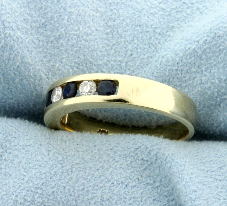 In 14K yellow gold, this band contains 1/4ct total weight of high quality SI clarity/G color diamonds. Also it contains 1/3ct total weight of sapphires with great color & Clarity. 5.0g