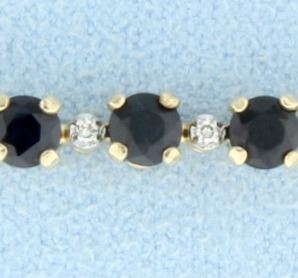 In 10K yellow gold, it is 7 1/4 inches long, with safety clasp. It contains twenty nine 3.5mm sapphires, approx. 4.5ct total weight. Also contains .15ct total weight of diamonds. 6.7g