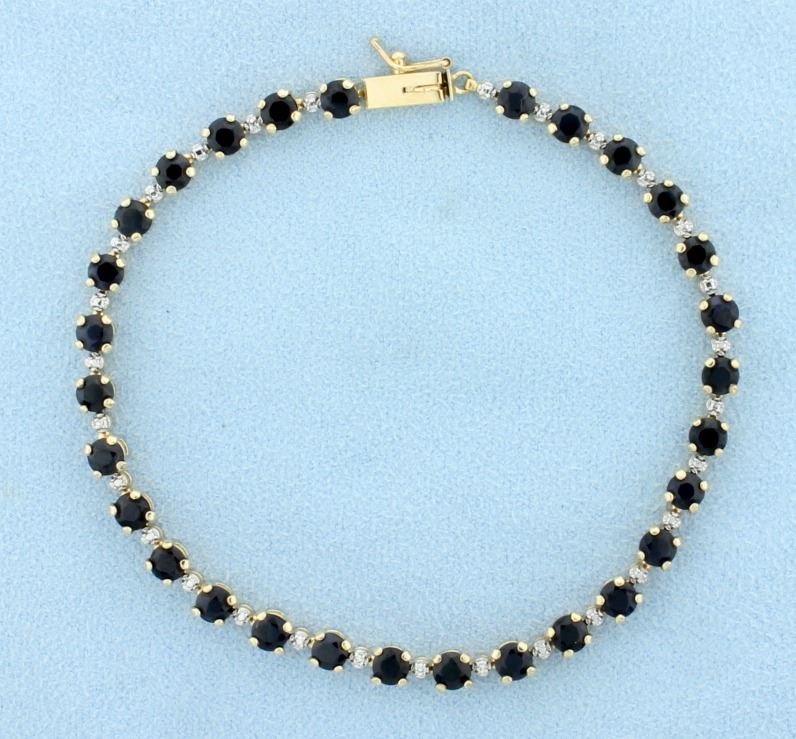 In 10K yellow gold, it is 7 1/4 inches long, with safety clasp. It contains twenty nine 3.5mm sapphires, approx. 4.5ct total weight. Also contains .15ct total weight of diamonds. 6.7g