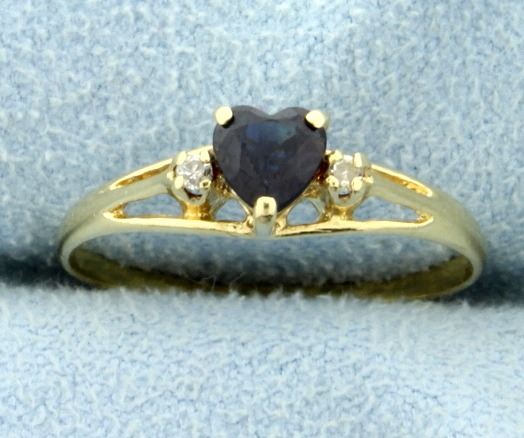 In 14K yellow gold, the ring contains one 4.5x4.5mm heart shaped sapphire with excellent clarity and deep blue color. Also two .02ct round diamonds. Size 6 1/4 1.2g