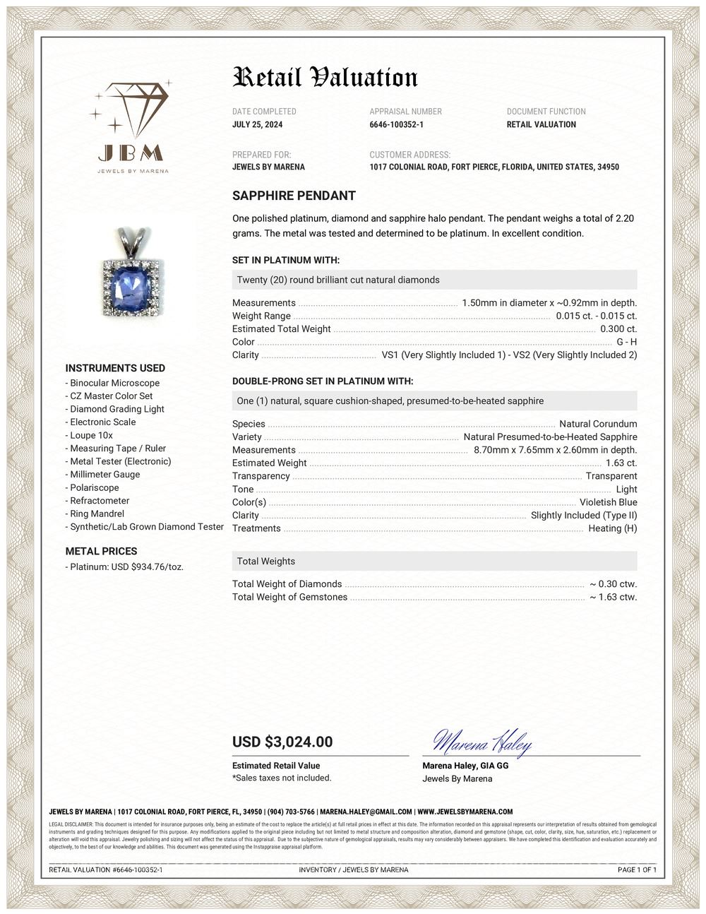 APPRAISAL REPORT: JBM appraised this item with an estimated retail replacement value of $3,024.00.