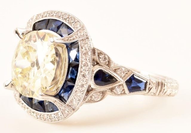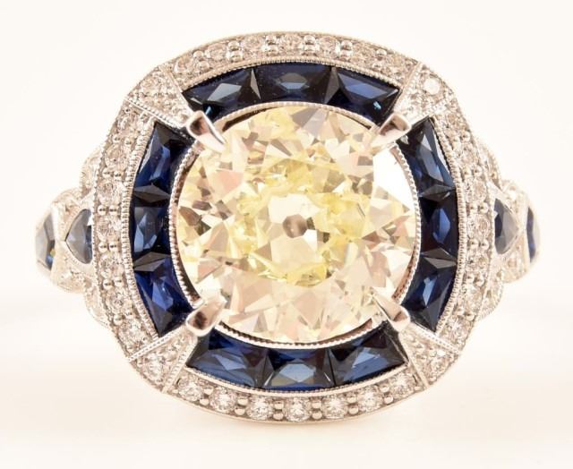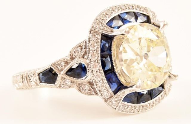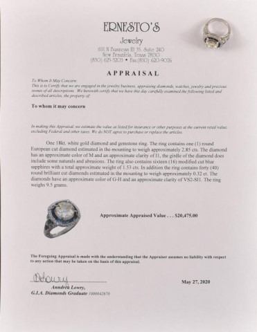 *With Appraisal. Approximate Appraised Value: $20,475. One 18kt white gold diamond and gemstone ring. The ring contains one (1) round European cut diamond estimated in the mounting to weigh approximately 2.85 cts. The diamond has an approximate color of M and an approximate clarity of I1, the girdle of the diamond does include some naturals and abrasions. The ring also contains sixteen (16) modified cut blue sapphires with a total approximate weight of 1.53 cts. In addition, the ring contains forty (40) round brilliant cut diamonds estimated in the mounting to weigh approximately 0.32 ct. The diamonds have an approximate color of G-H and an approximate clarity of VS2-SI1. The ring weighs 9.5 grams.