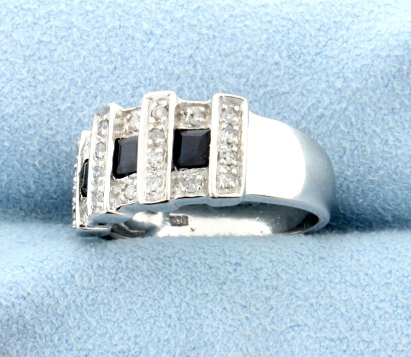 14K white gold with 1/4ct total weight of diamonds. The three 3x3mm square sapphires. Size 6 5.6g