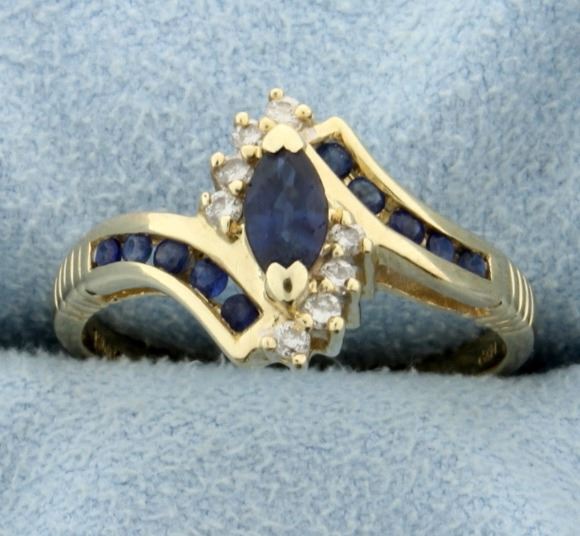 In 14K yellow gold, it contains one 6x3mm marquis, and ten 1.6mm round sapphires for a total weight of 1/2ct, all excellent color and clarity! The ring also contains eight .01ct diamonds. Size 7     2.8g