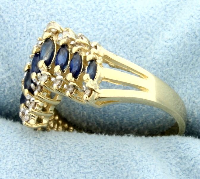 In 14K yellow gold, it contains seven natural marquise cut sapphires ranging from 3 to 4.5mm each. Also contains fourteen .01ct diamonds. Size 8 4.1g