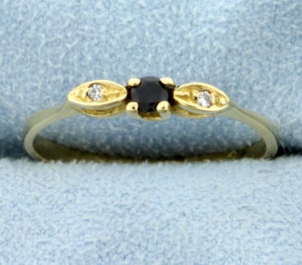 Stamped "750" yellow gold, this ring contains a 3mm round sapphire gemstone with beautiful deep blue color, and two .01ct diamonds that also have excellent color and clarity. Size 8 3/4 1.7g