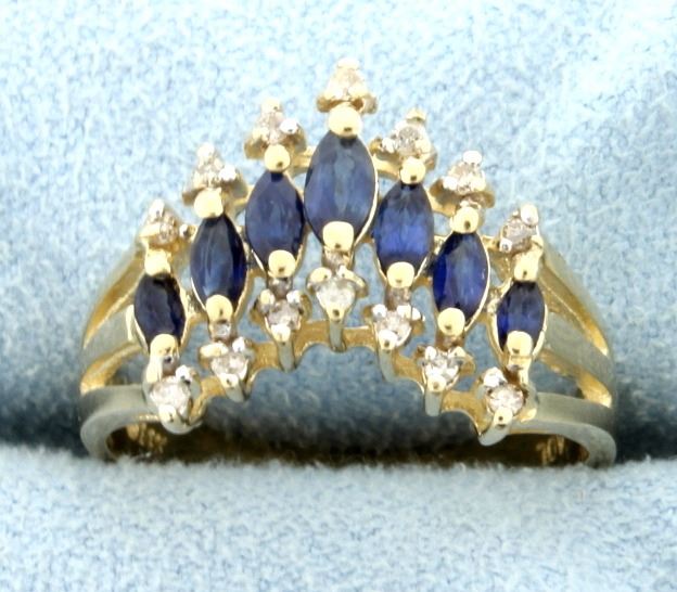 In 14K yellow gold, it contains seven natural marquise cut sapphires ranging from 3 to 4.5mm each. Also contains fourteen .01ct diamonds. Size 8 4.1g
