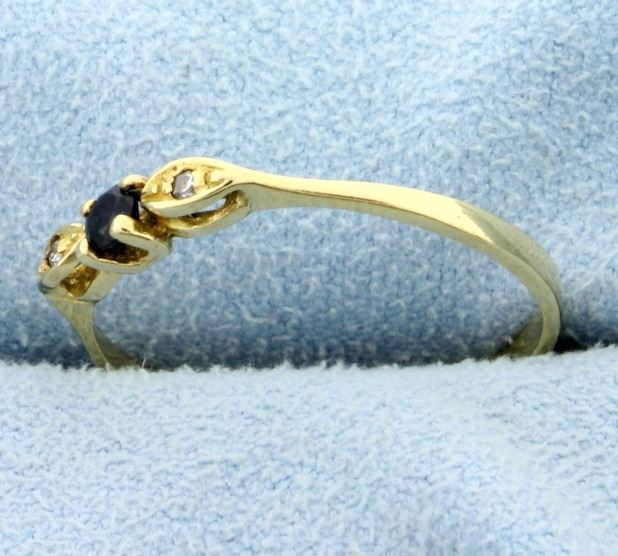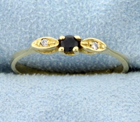 Stamped "750" yellow gold, this ring contains a 3mm round sapphire gemstone with beautiful deep blue color, and two .01ct diamonds that also have excellent color and clarity. Size 8 3/4 1.7g