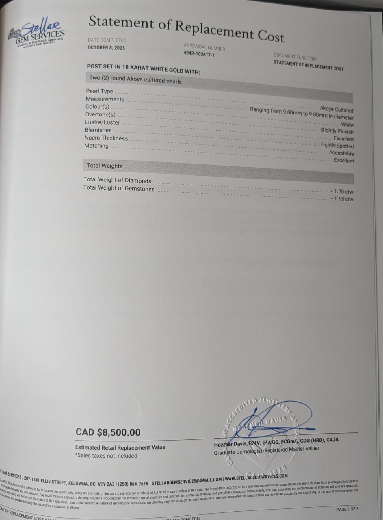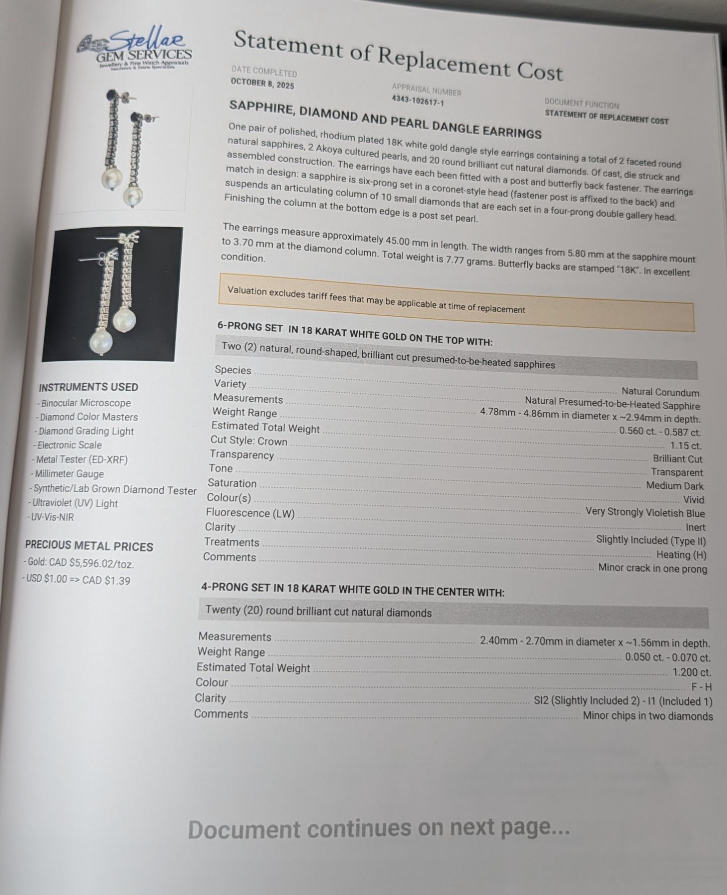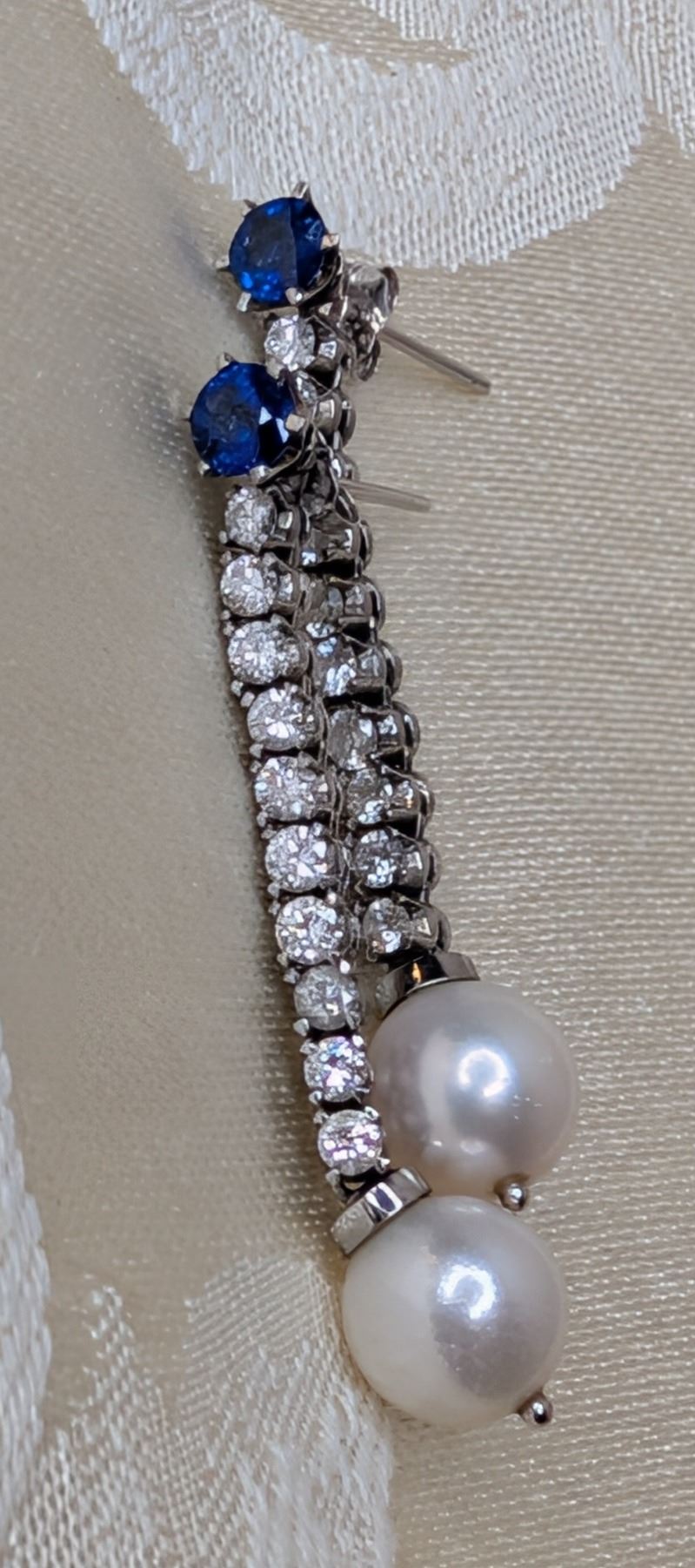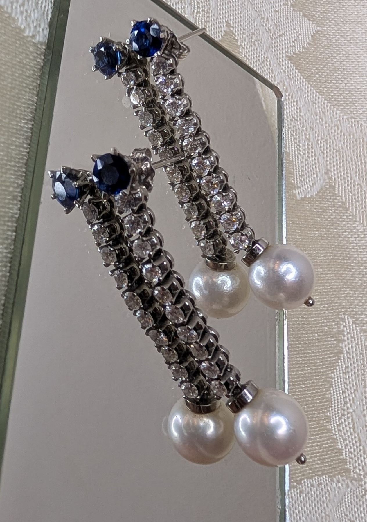 18k white gold blue sapphire (approx 1.15cttw), white diamond (approx 1.20cttw) and white Akoya cultured pearl drop stud earrings - replacement value $8,500, see attached appraisal