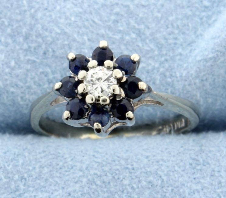 This darling 14k white gold ring has 8 round 2.5mm Sapphires of A quality. The center brilliant cut diamond weighs approximately 0.20 carats and is of VS2 clarity and G color! Great looking piece! Size 6 1/2 2.7g